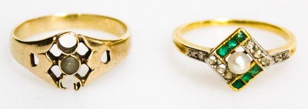 3035. Lot de 2 bagues serties de diamants, d'émeraudes et d'une perle