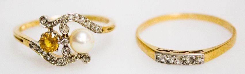 3025. Lot de 2 bagues serties de diamants, d'un saphir jaune et d'une perle