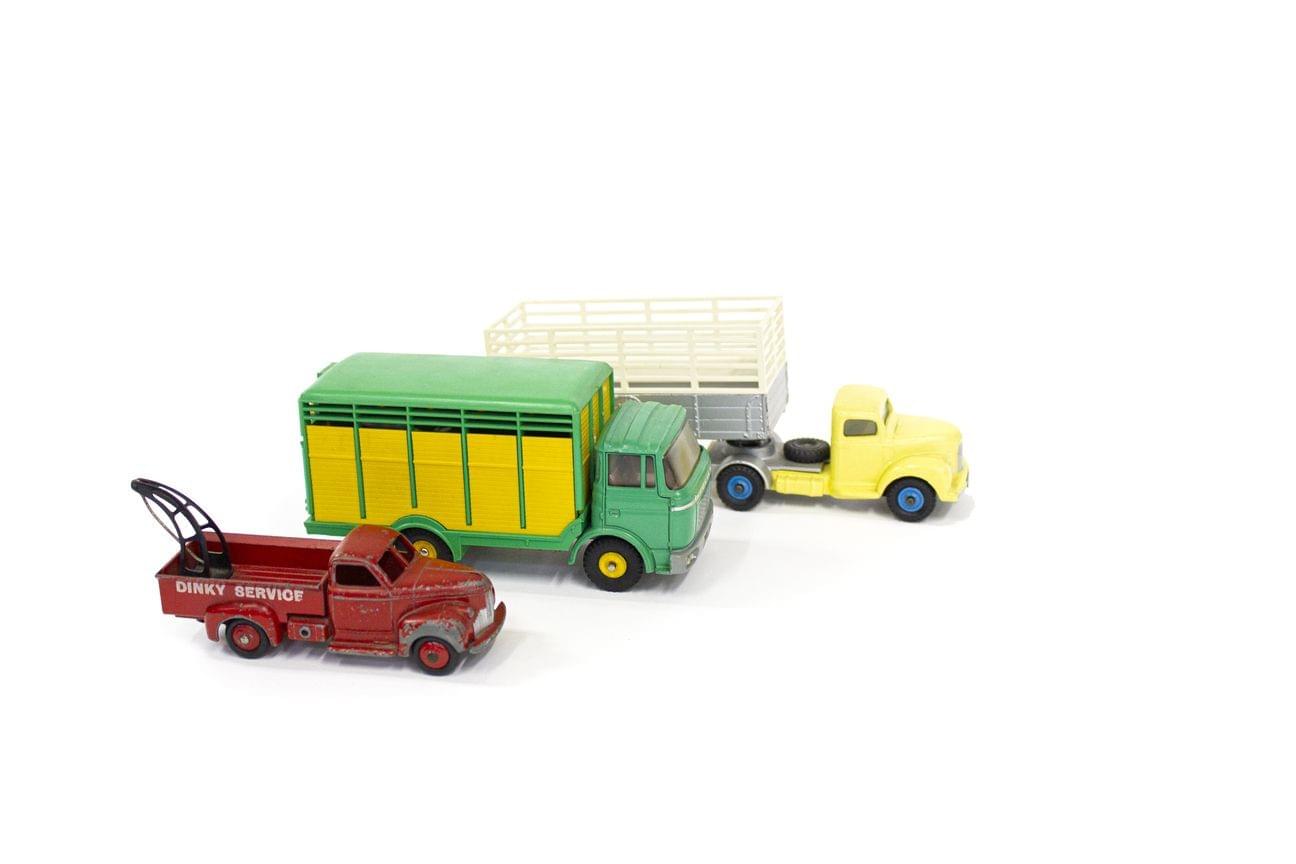 Une bétaillère Berliet CAK (577), un camion semi-remorque Commer et un camion dépannage avec chèvre Dinky service, L de 10 à 17 cm