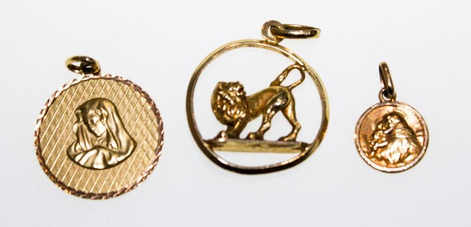 3114. Lot de 3 pendentifs représentant un lion, la Vierge et pendentif religieux