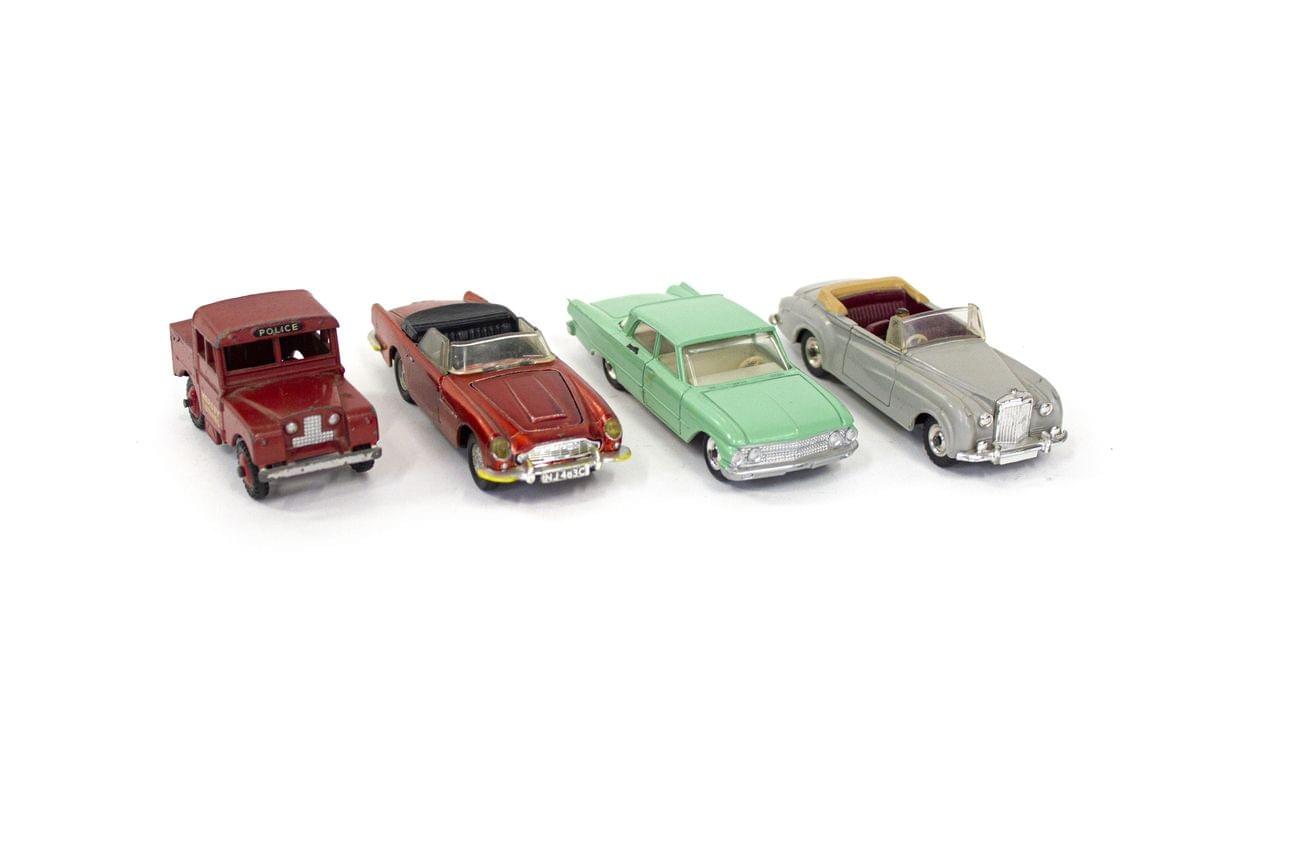 Une Aston Martin DB 5 (110), une Land-Rover pick-up (255), une Ford Fairlane (148) et une Bentley S2 (194), L de 7,5 à 11 cm