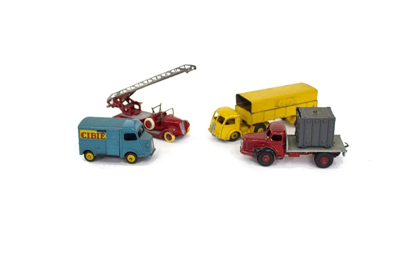 Un camion Berliet "34" plateau porte-container, une voiture de pompier Delahaye (32D), un fourgon HY Citroën (25C) publicité Cibié, un semi-remorque Panhard bâché publicité Kodak, L de 8,5 à 16 cm