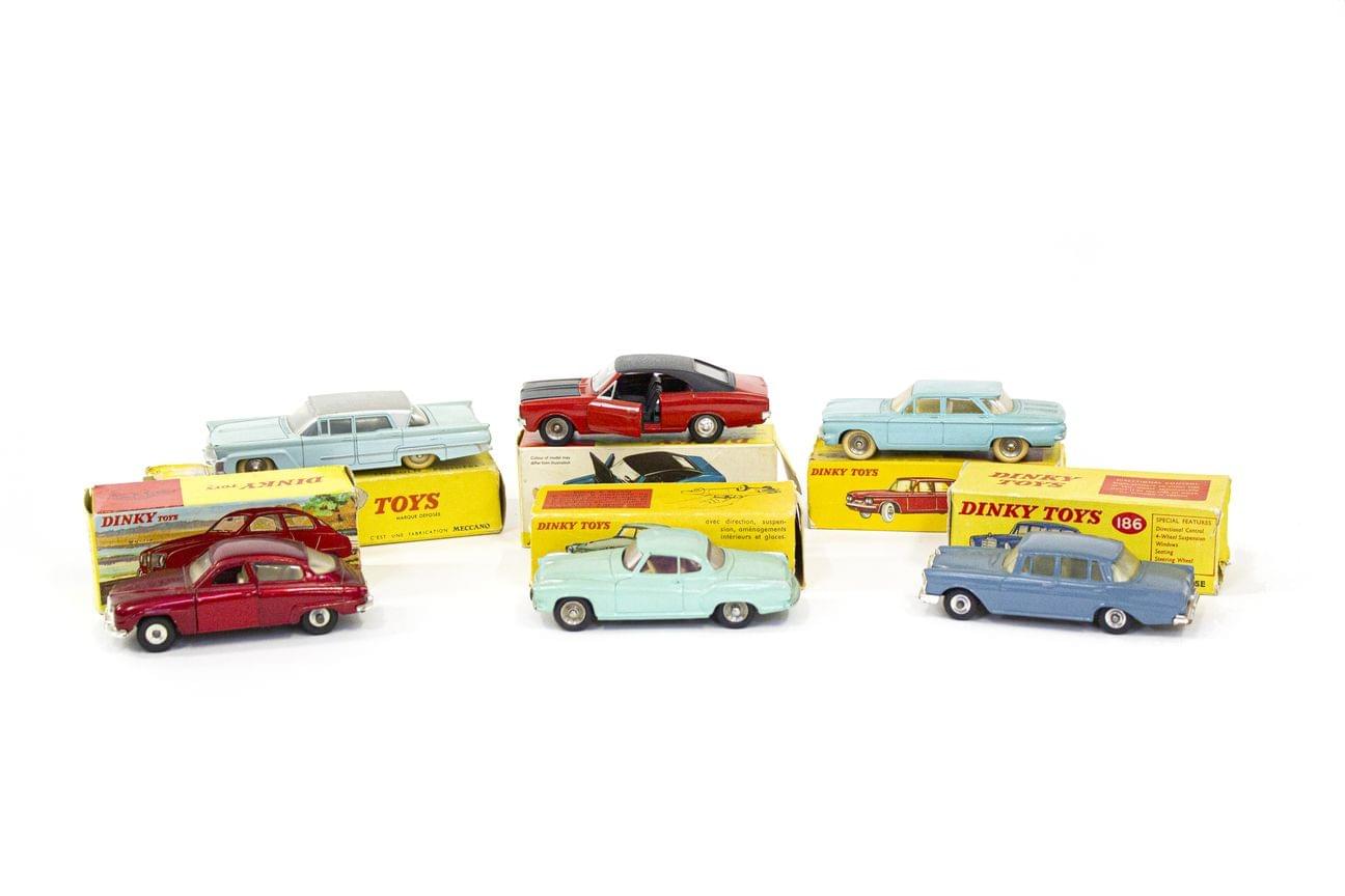 Une Saab 96, une Opel Rekford (1420), une Mercedes Benz 220 SE (186), un Coupé Borgward "Isabella" (549), une Lincoln "Première" (532) et une Chevrolet "Corvair" (552), avec leur boîte abîmée.