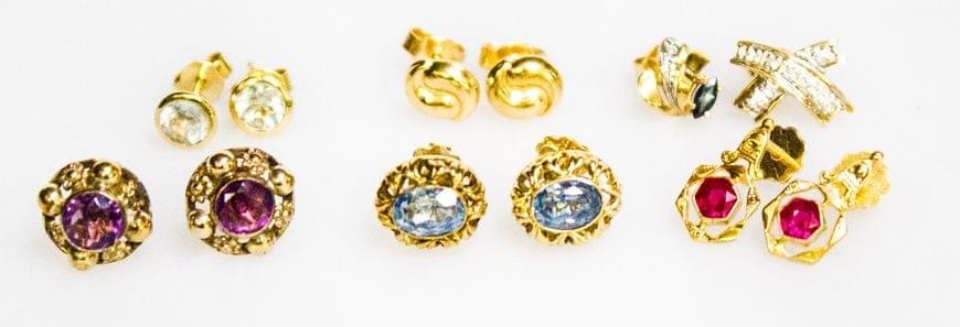 3087. Lot de 6 paires de clous d'oreilles sertis de diamants, d'améthyste, aigues-marines, saphirs synthétiques, rubis synthétiques, spinelles synthétiques