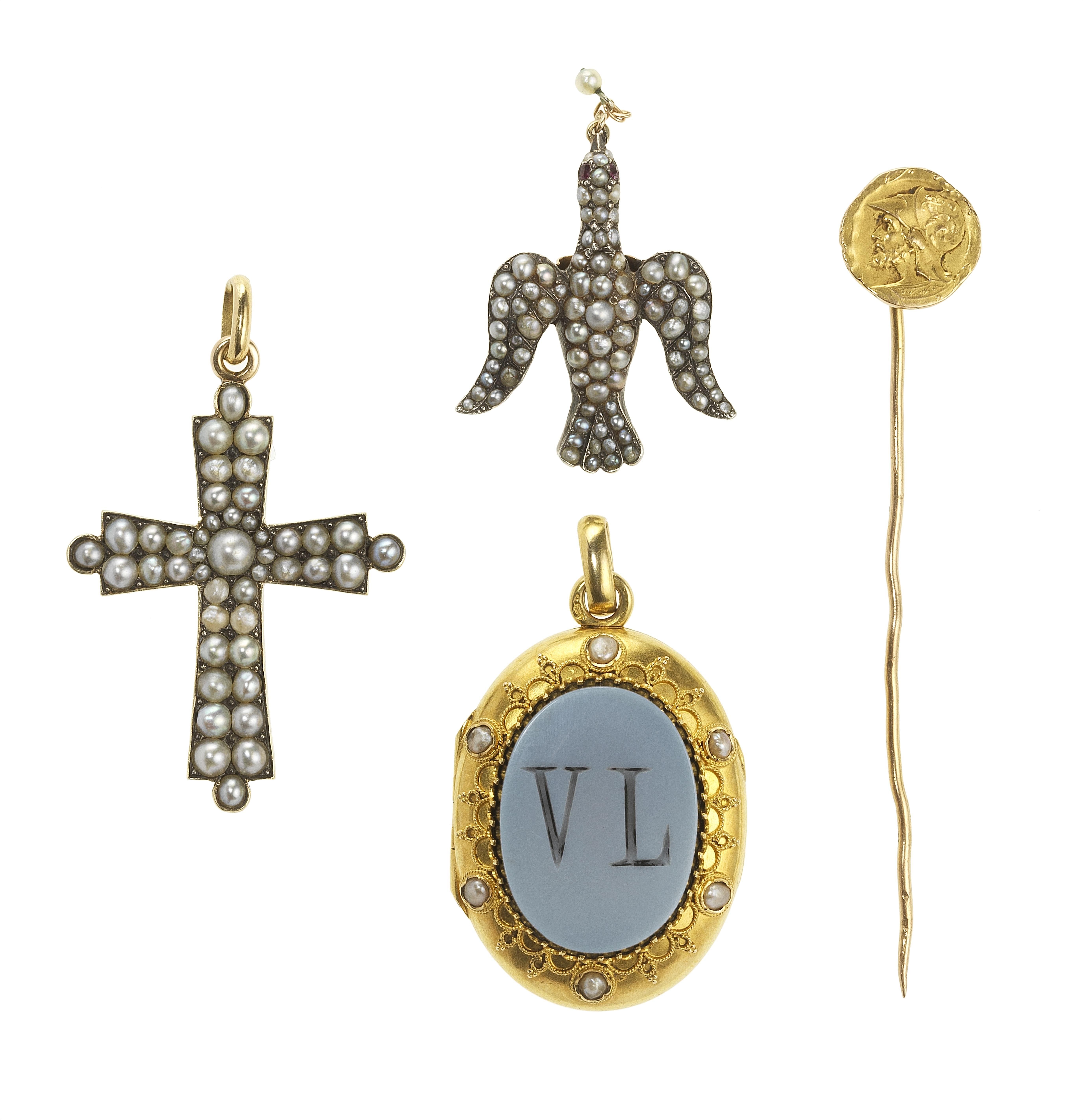 Une épingle à cravate, un pendentif porte-photo serti d'une plaque d'agate monogrammée VL et entourée de demi-perles fines, une croix sertie de demi-perles fines et un pendentif à motif de colombe, or 750, or bas titre et argent, H entre 2,5 et 6 cm, poids brut 17 g