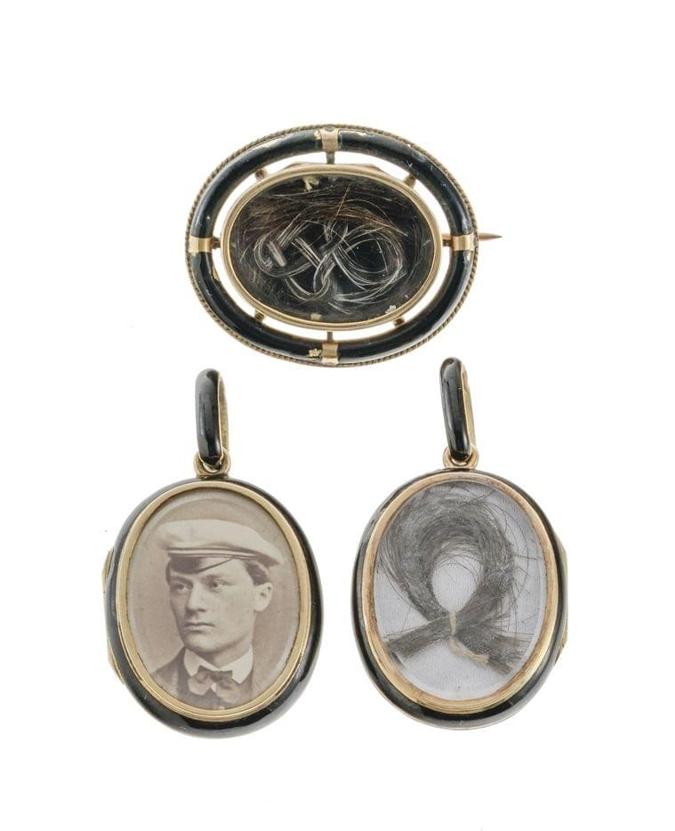 3110. Lot de bijoux de cheveux comprenant deux pendentifs et une broche porte-photo émaillés