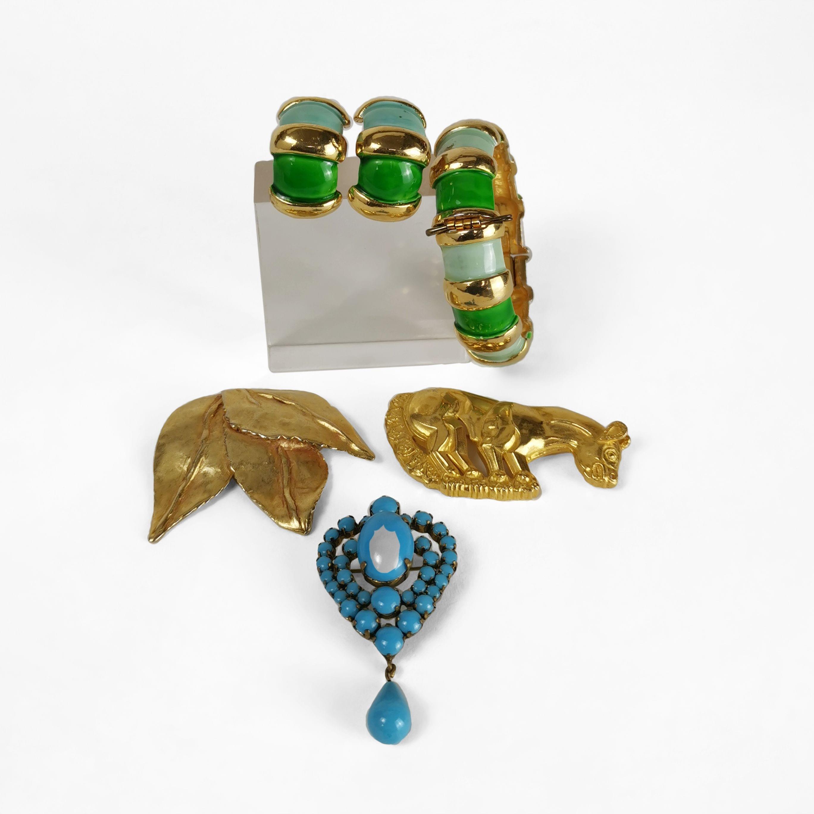 Comprenant un bracelet et des clips d'oreilles émaillés signés "Original by Robert", une broche feuille signée Delphine Nardin, une broche panthère dans le style antique et une broche sertie de pierres d'imitation turquoises, métal et métal doré, D 6 cm, H entre 3 et 6 cm