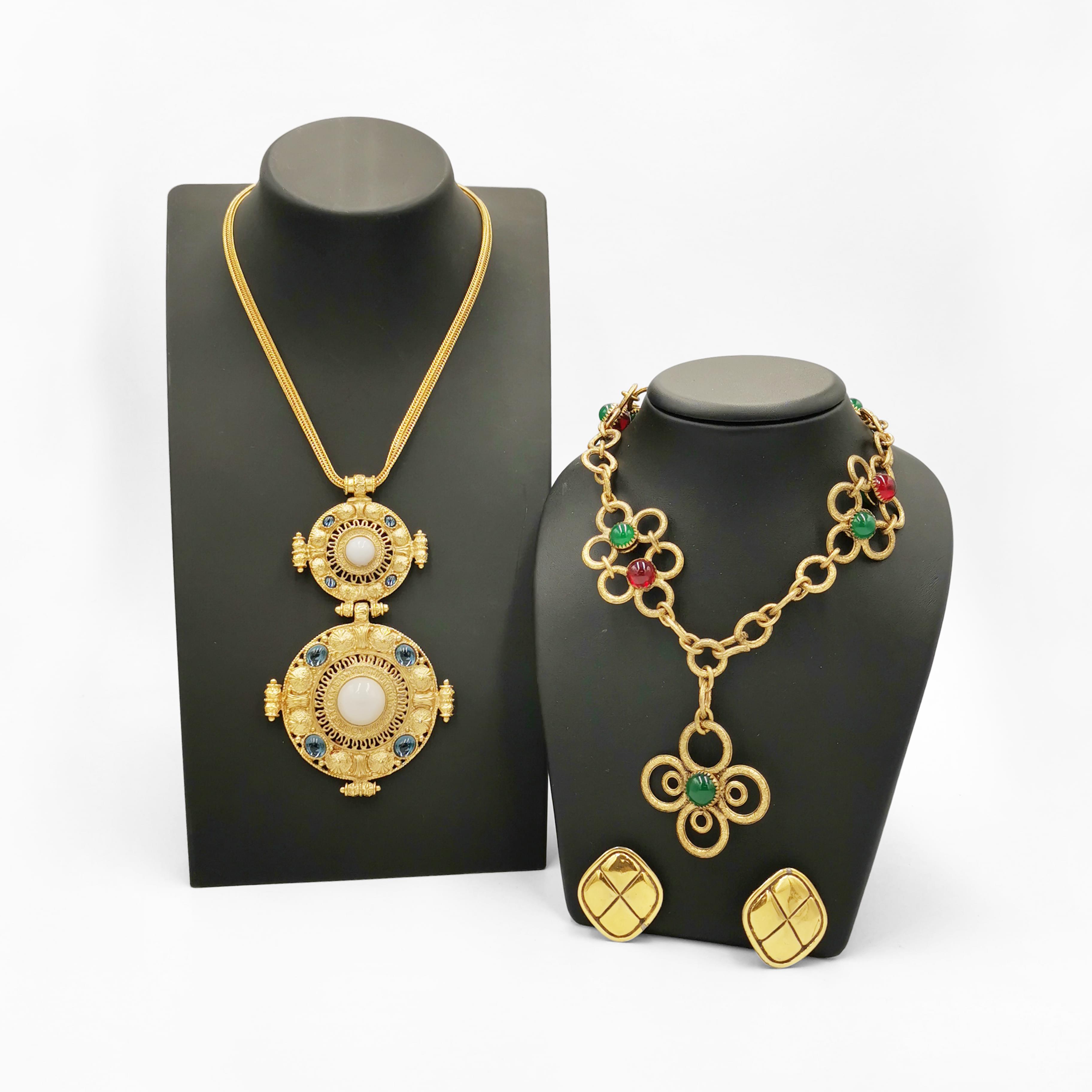 Des clips d'oreilles Chanel à motif de losanges à effet matelassé, un collier Jean-Louis Scherrer retenant un important pendentif et une ceinture à maille ronde et motifs de fleurs, métal doré et pierres d'imitation, H 3,5 cm, L 56 cm et 81 cm