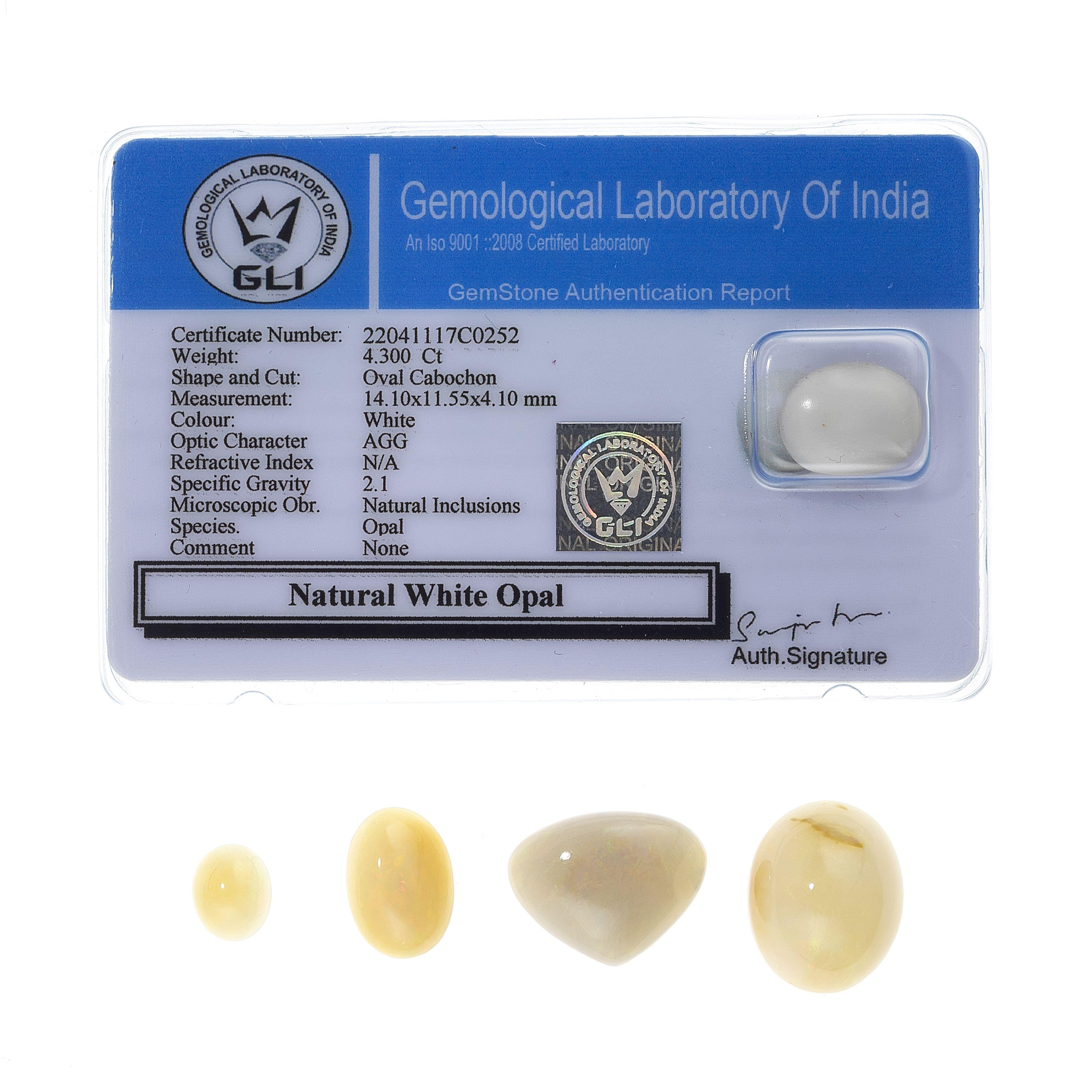 3436. *Lot de cinq opales à fond blanc taille cabochon, ovale et poire