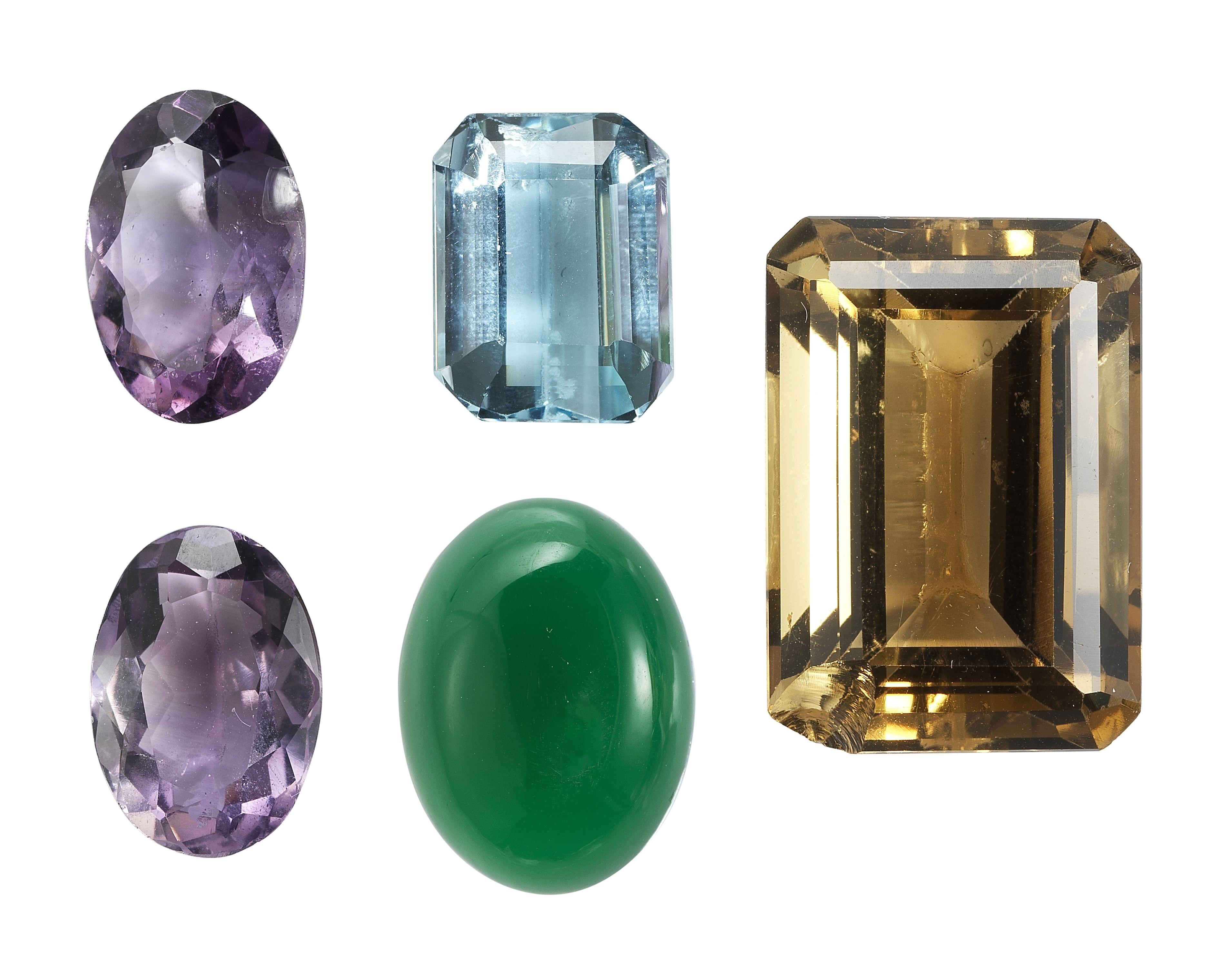 Une topaze bleue taille rectangle (env. 7,7 ct), deux améthystes taille ovale (env. 3,75 et 4,25 ct), une citrine taille rectangle (env. 25,4 ct) et une agate verte taille cabochon ovale (env. 7,30 ct)