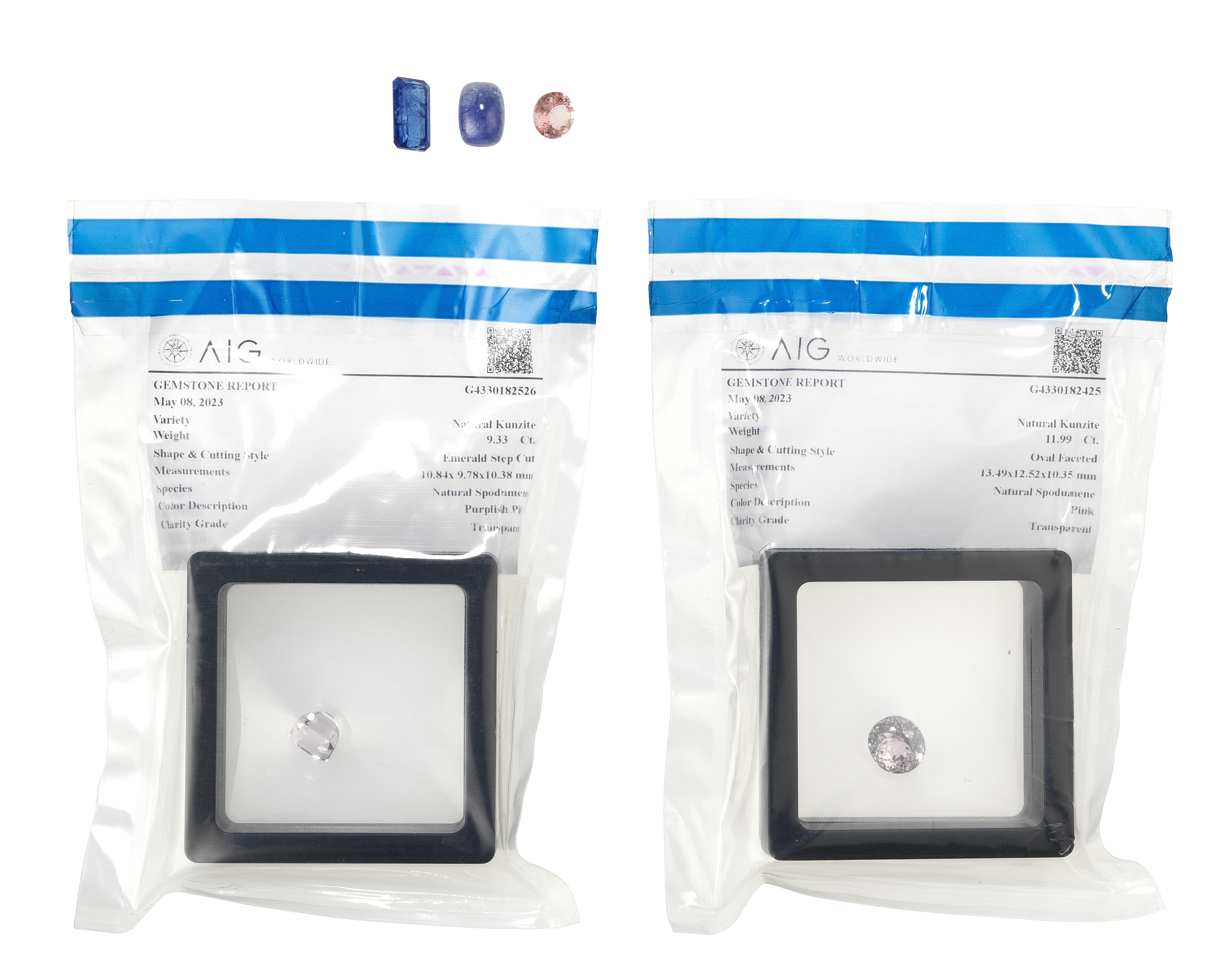 Trois kunzites taille ovale, brillant et émeraude (11,99, 9,33 et 5,1 ct) et deux tanzanites (12,1 et 11,3 ct), accompagnés de certificats AIG, GFCO et GIL. Pour les lots précédés d'un *, la TVA de 7,7% est due sur l'entier du prix d'adjudication.