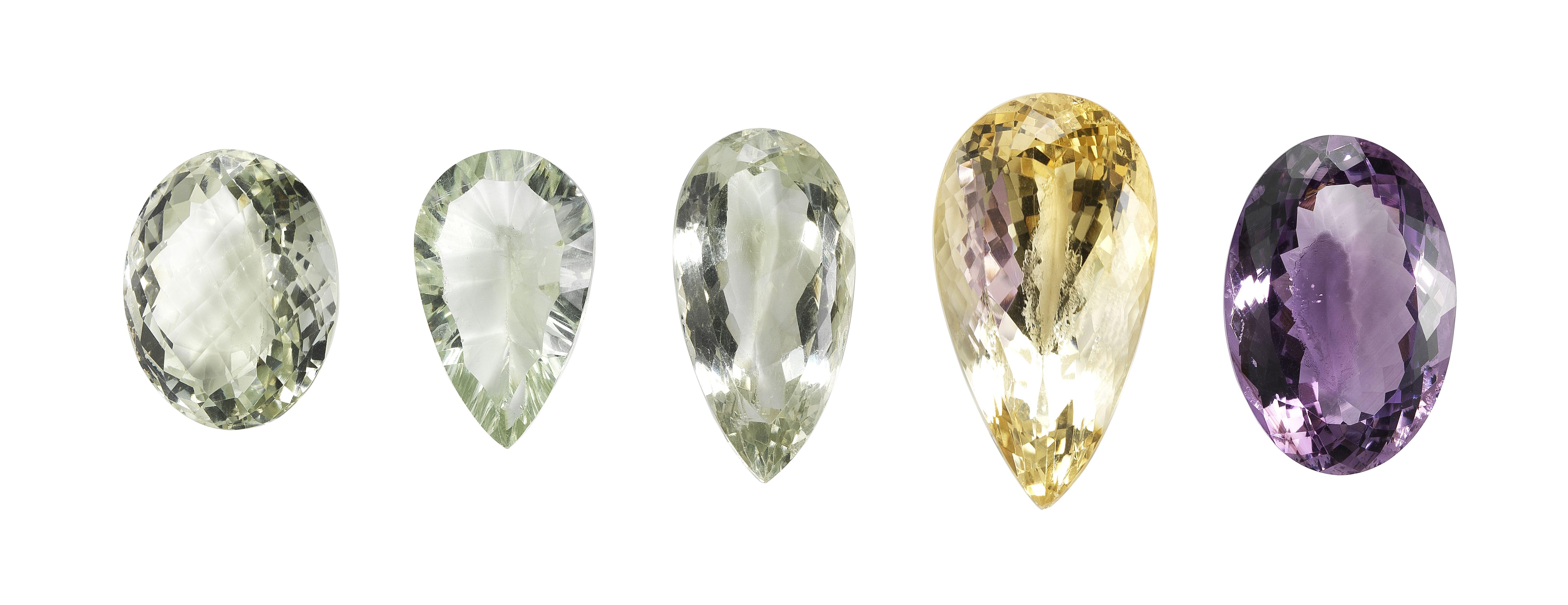 Une améthyste taille ovale (31,14 ct), une citrine taille poire (44,95 ct), et trois prasiolites, l'une taille ovale facettée (22,72 ct) et les deux autres taille poire (13,23 et 22,72 ct), accompagnées de certificats ITLGR, GLI, IGL&I. Pour les lots précédés d'un *, la TVA de 7,7% est due sur l'entier du prix d'adjudication.