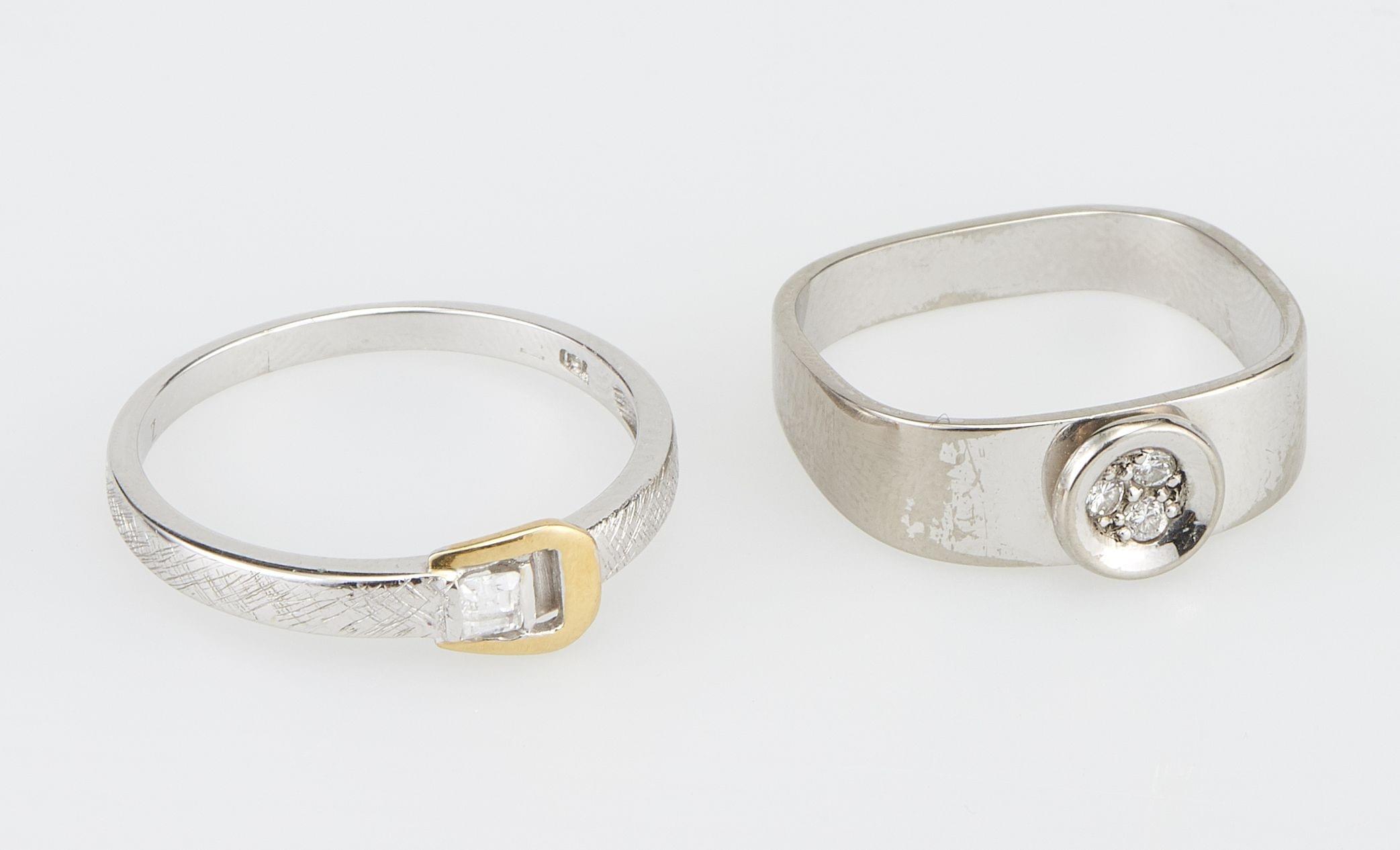 3329. Lot de deux anneaux, l'un à motif de ceinture sertie d'une pierre d'imitation pour le diamant et l'autre sertie de diamants
