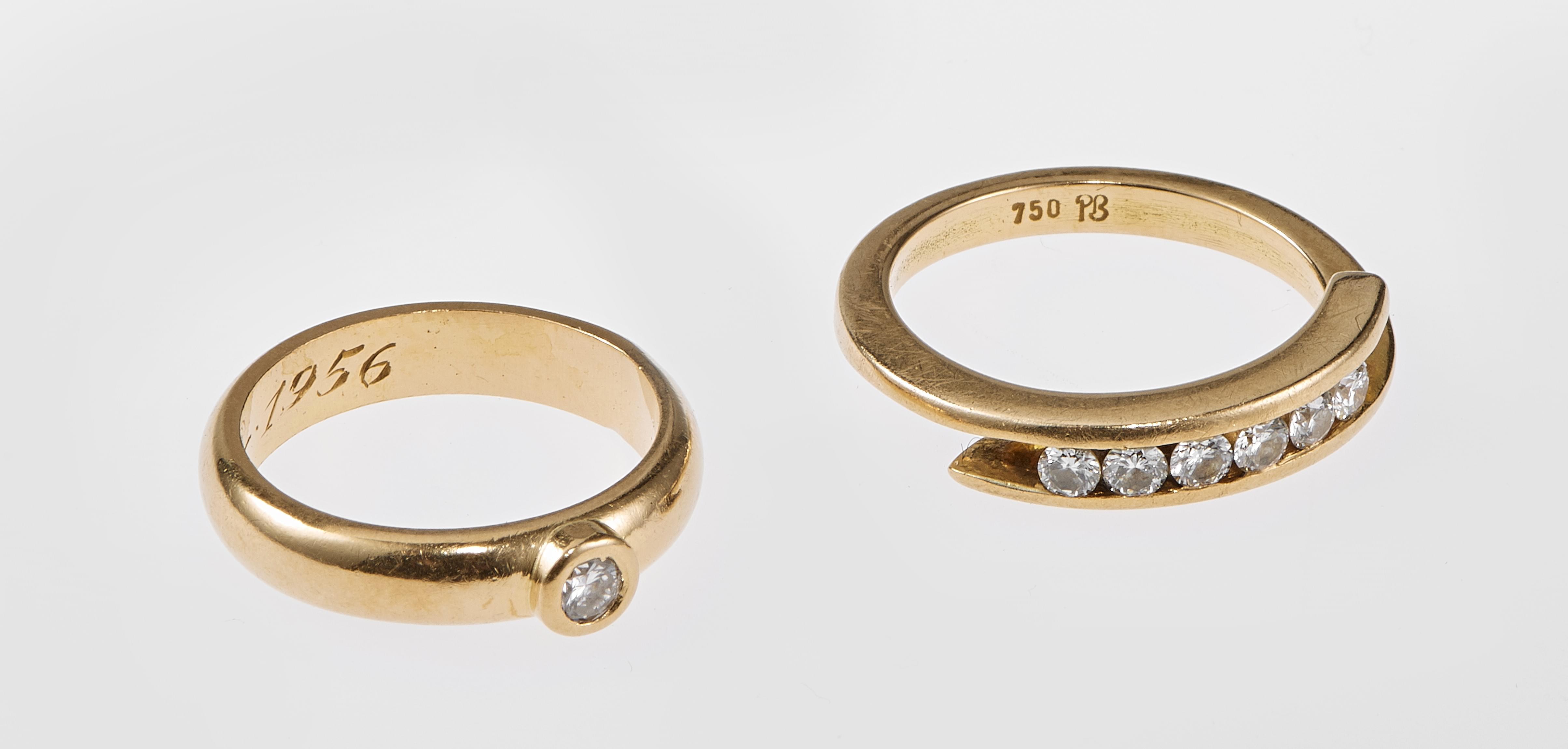 3218. Lot de deux anneaux, l'un serti d'un petit diamant et l'autre serti d'une ligne de six diamants