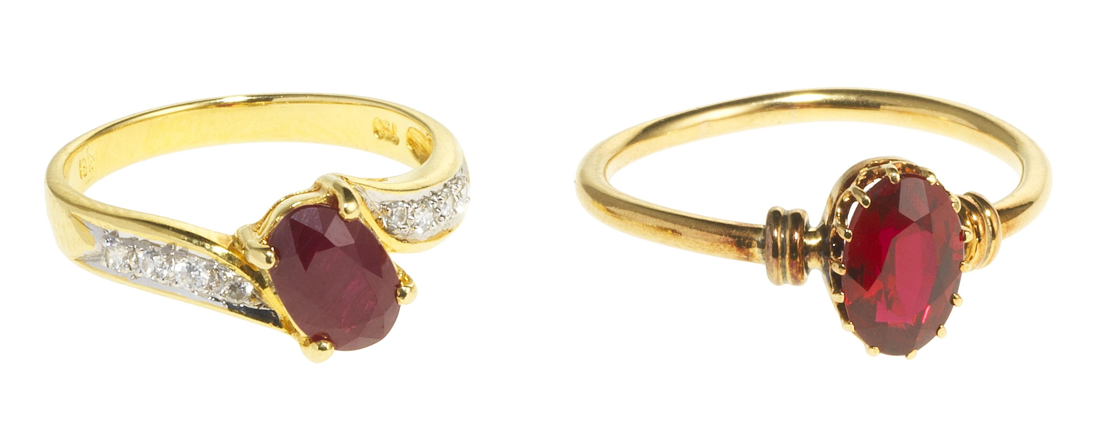 L'une sertie d'un rubis taille ovale (env. 1 ct) épaulé de deux lignes de diamants, la seconde sertie d'un rubis synthétique taille ovale, or 750, doigt 51-11 et 57-17, 5 g