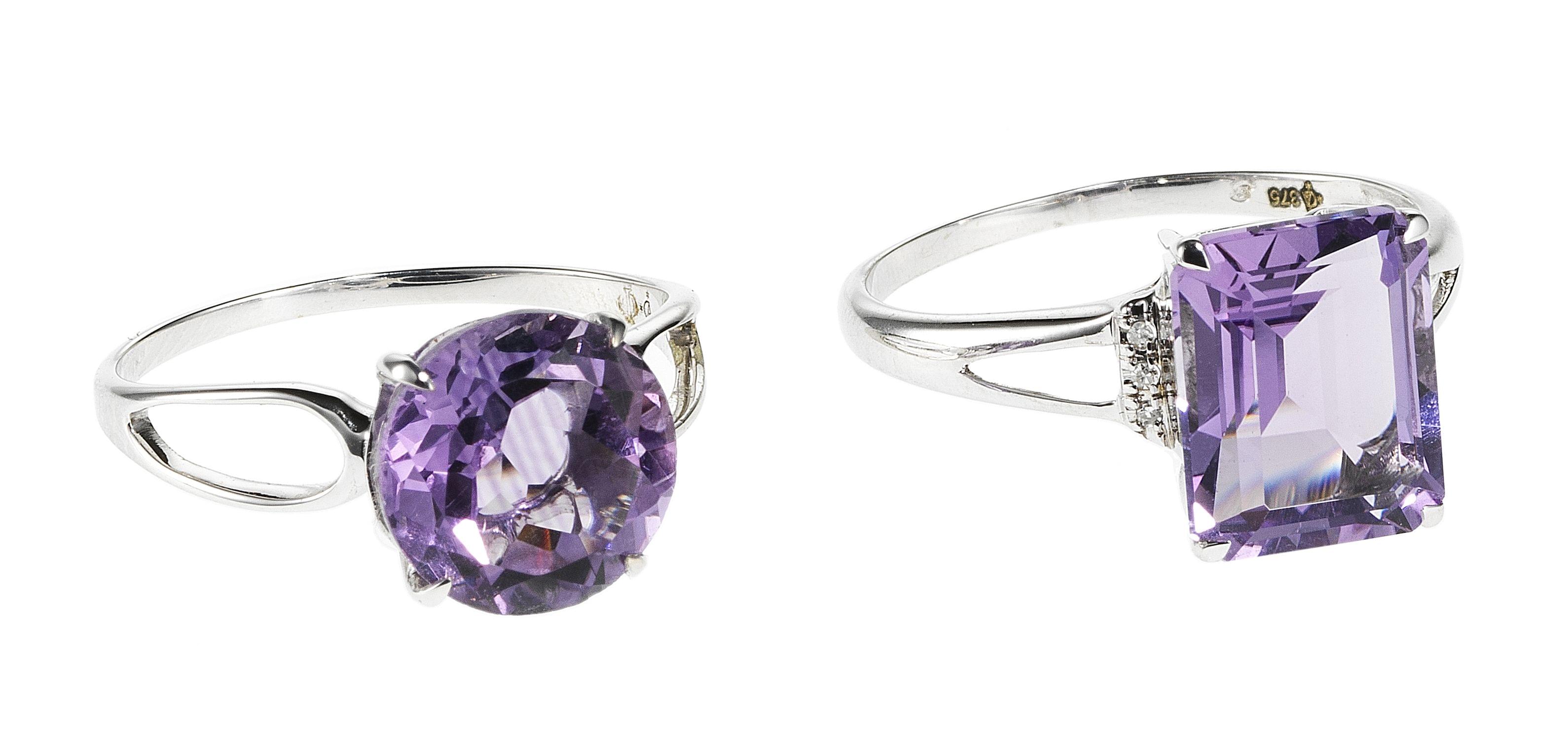L'une sertie d'une améthyste taille rectangle (env. 2,8 ct) épaulée de petits diamants, l'autre sertie d'une améthyste taille brillant (env. 2 ct), or gris 375, doigt 52-12 et 53-13, 3 g. Pour les lots précédés d'un *, la TVA de 7,7% est due sur l'entier du prix d'adjudication.