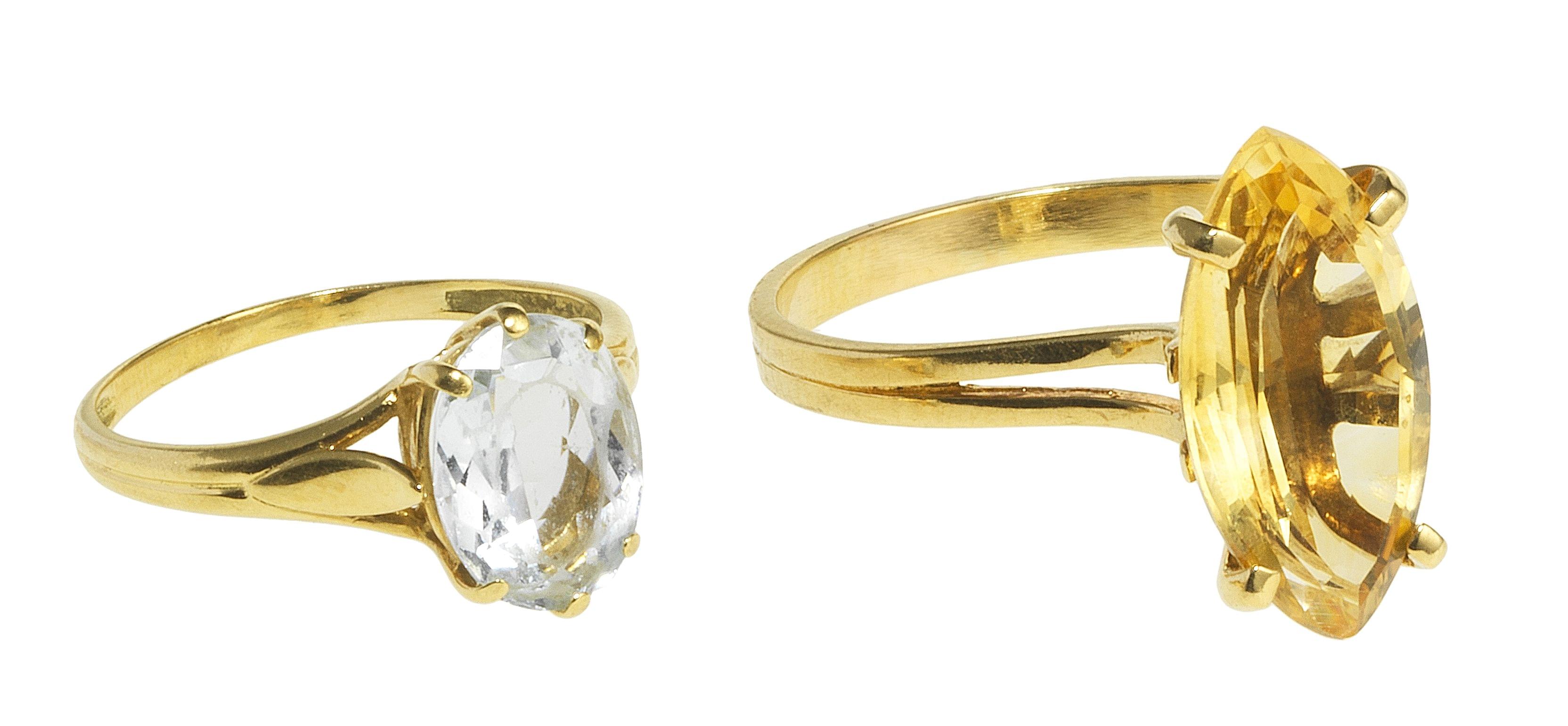 L'une sertie d'une citrine navette et l'autre d'une aigue-marine taille ovale (env 1,3 ct), travail français, or 750, doigt 58-18 et 49-9, poids brut 5 g