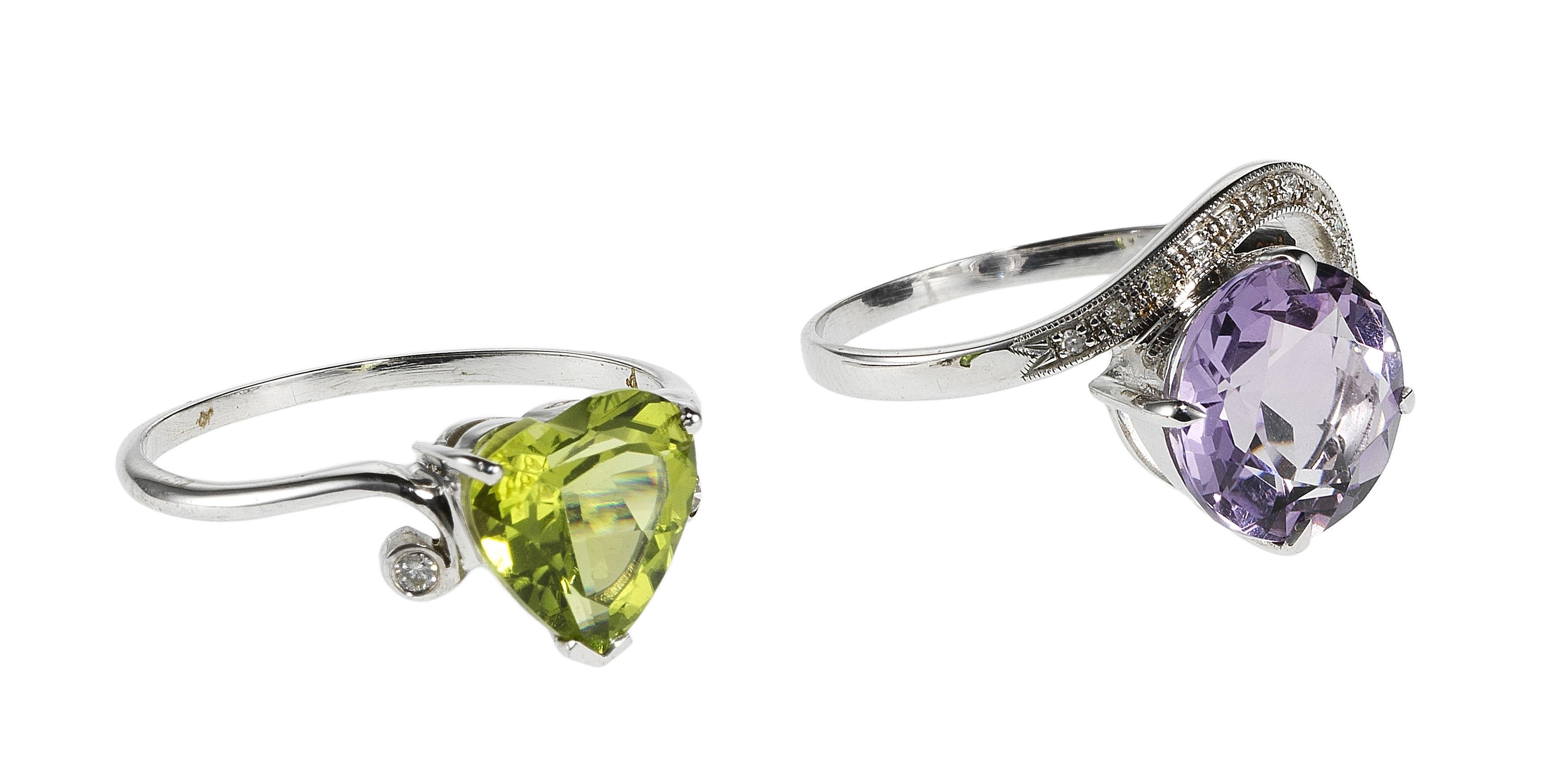 L'une sertie d'un péridot taille cœur épaulé de petits diamants et l'autre sertie d'une améthyste taille brillant (env. 2 ct) rehaussée d'une ligne de diamants, or gris 375, doigt 52-12 et 53-13, poids brut 3 g. Pour les lots précédés d'un *, la TVA de 7,7% est due sur l'entier du prix d'adjudication.