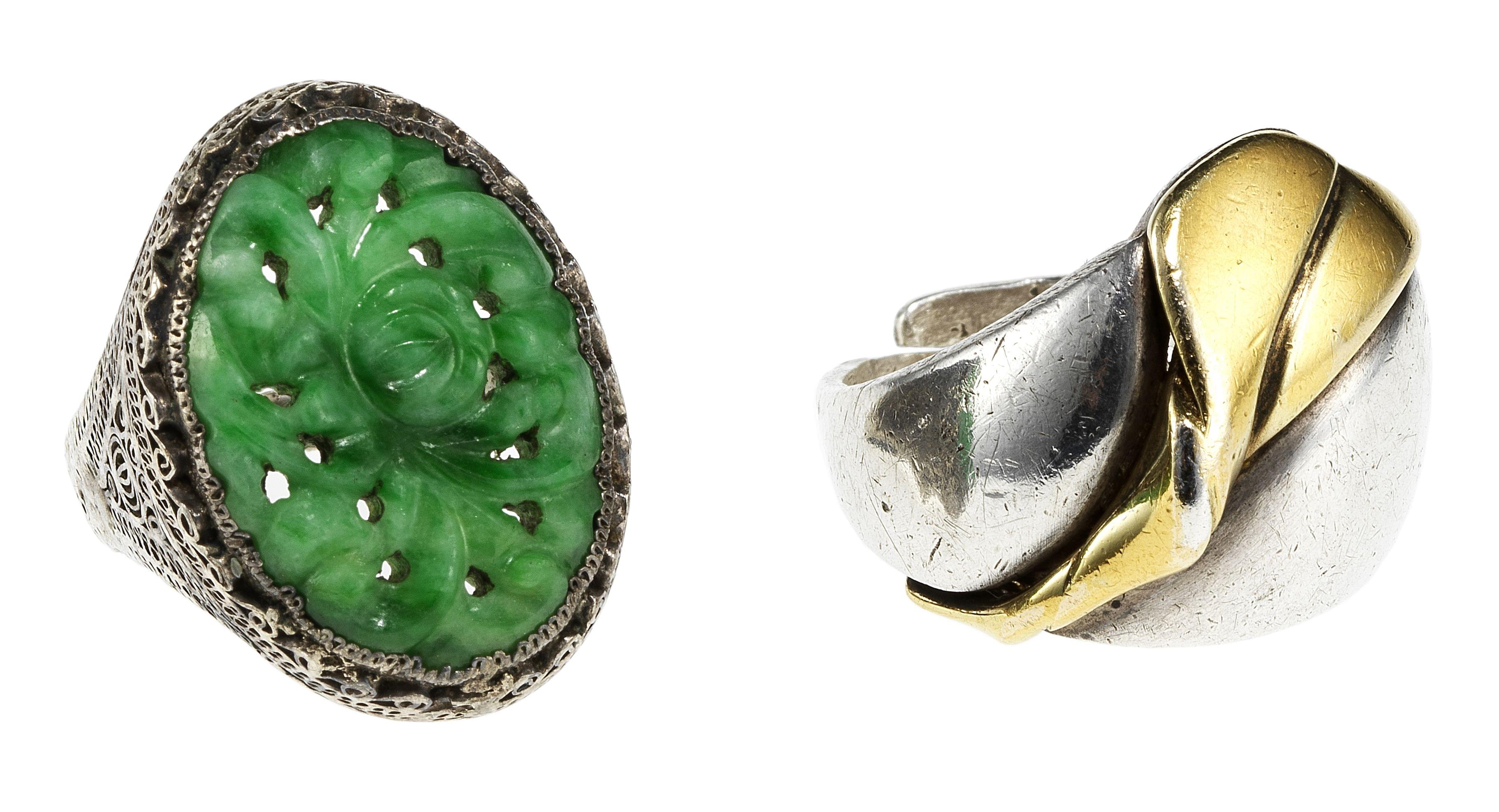 L'une design à deux tons de métal, l'autre centrée d'un jade sculpté, argent et vermeil 925, doigt env. 55-15