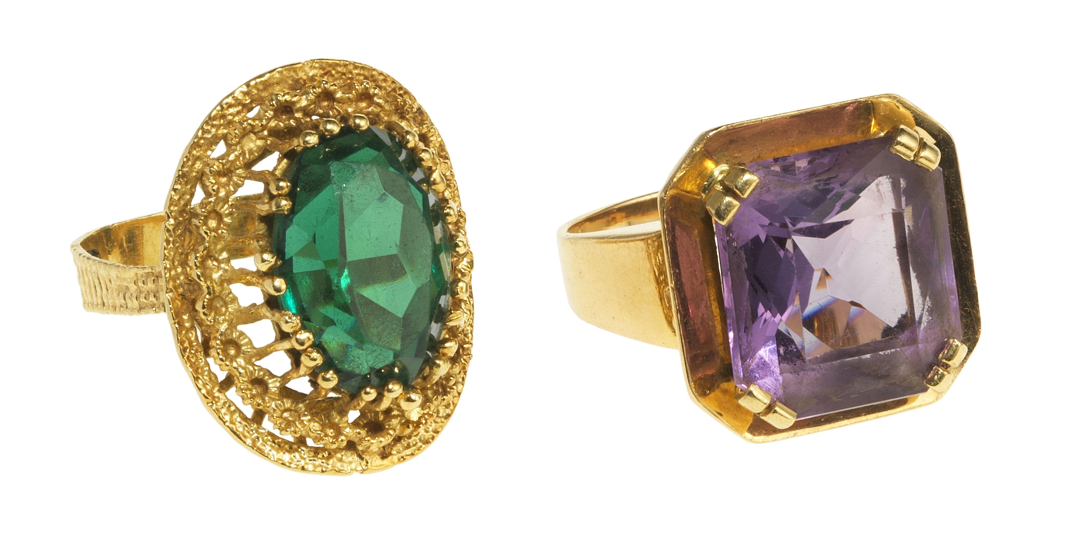 L'une sertie d'une améthyste octogonale (env. ), l'autre sertie d'un verre d'imitation, travail français, or 750, doigt 52-12 et 54-14, poids brut 17 g