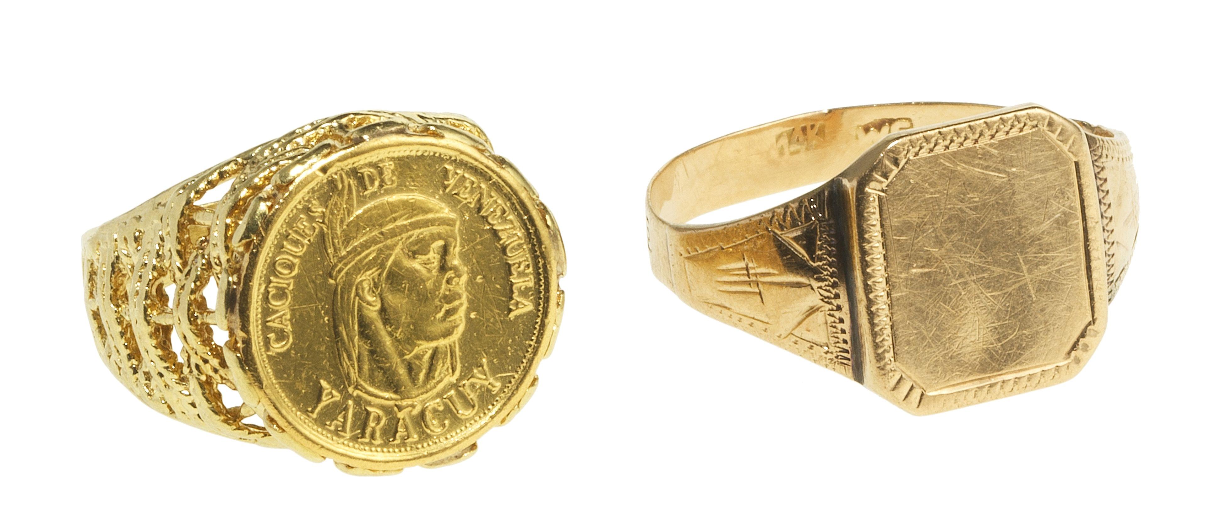 3258. Lot de deux bagues-chevalières, l'une sertie d'une pièce vénézuélienne