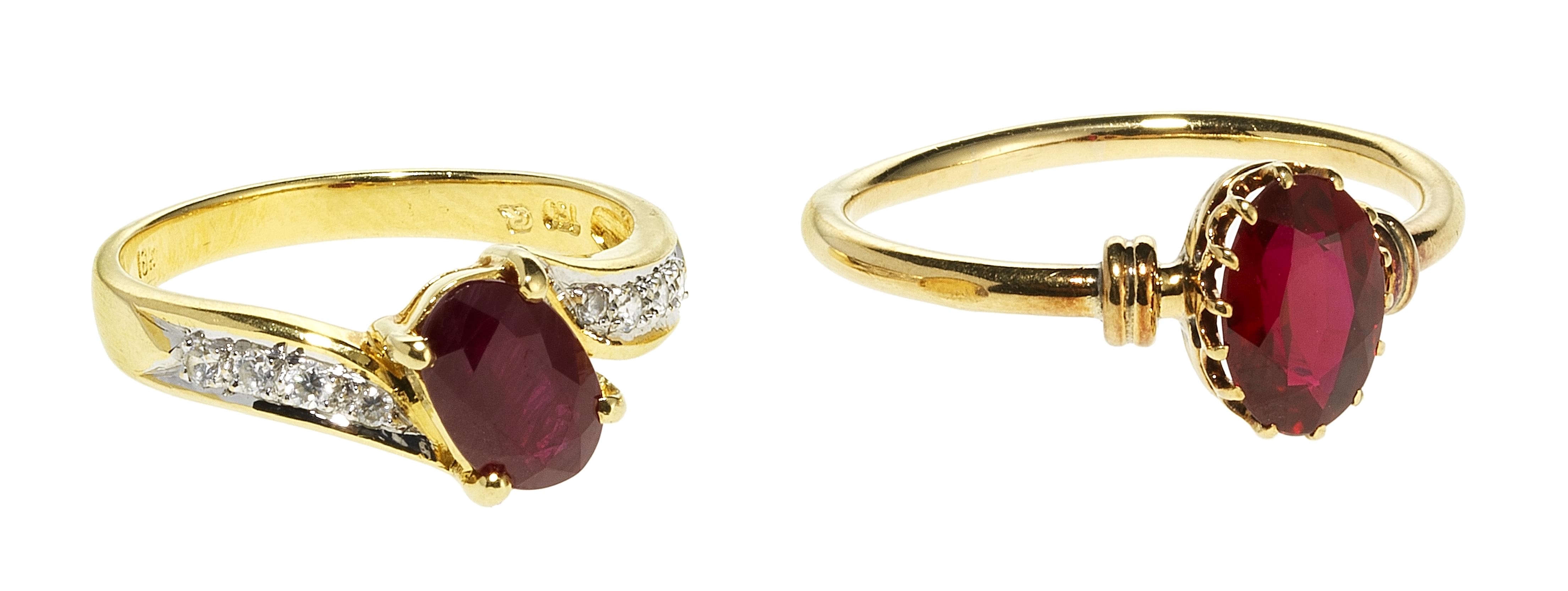 L'une sertie d'un rubis taille ovale (env. 1 ct) épaulé de deux lignes de diamants, la seconde sertie d'un rubis synthétique taille ovale, or 750, doigt 51-11 et 57-17, 5 g