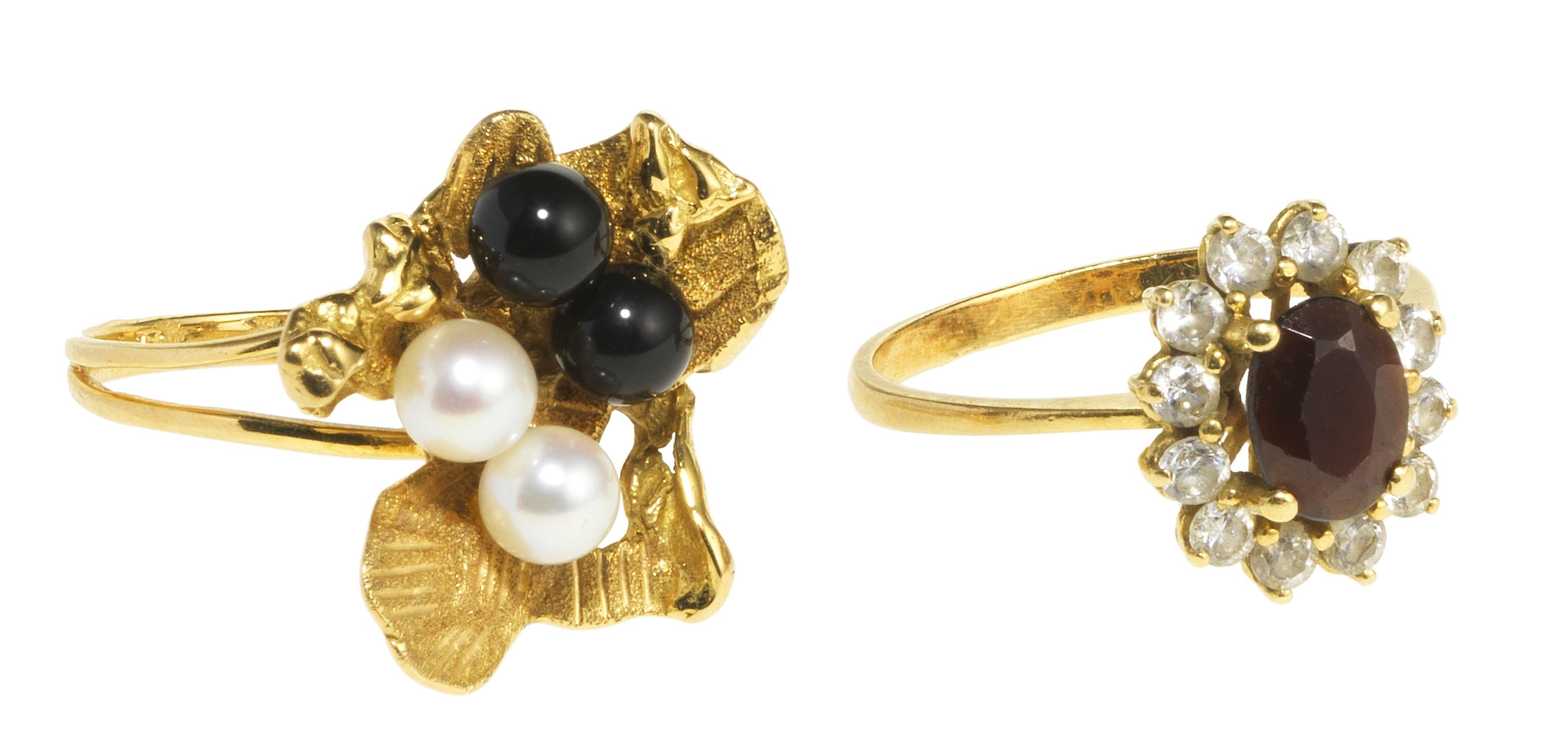 L'une sertie de perles et perles d'onyx et l'autre centrée d'un grenat taille ovale entouré de pierres d'imitation pour le diamant, travail français, or 750, doigt 55-15 et 58-18, 10 g