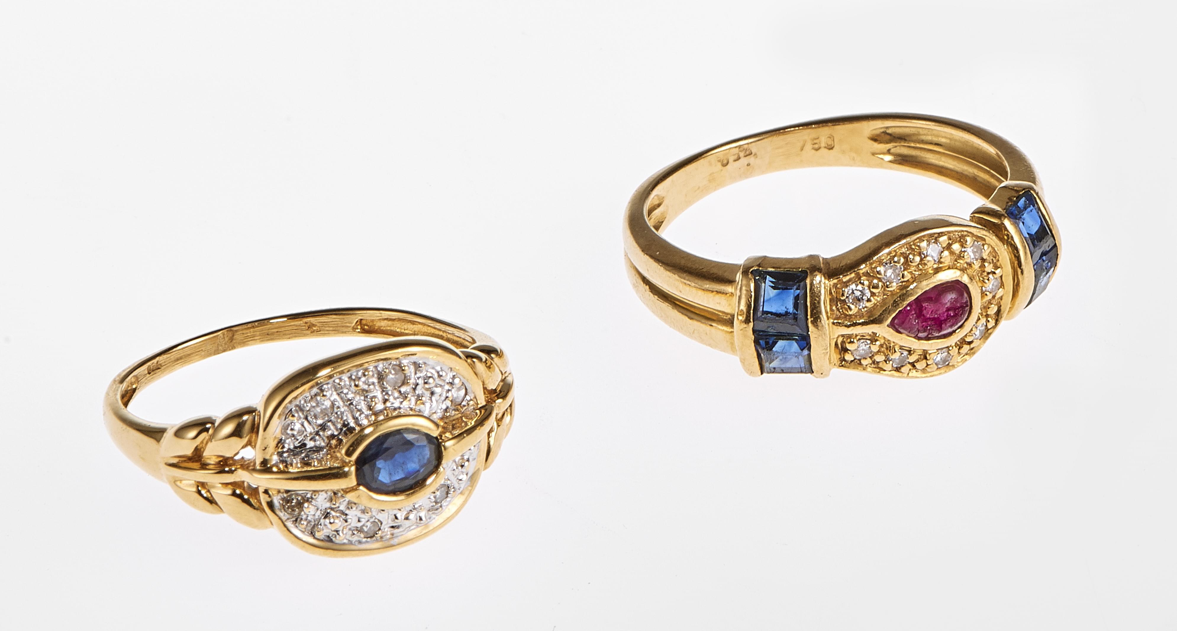 3202. Lot de deux bagues, l'une sertie d'un saphir entouré d'un pavage de diamants et l'autre sertie d'un rubis épaulé de saphirs et de diamants