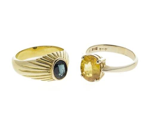 3100. Lot de deux bagues, l'une sertie d'un saphir (env. 0.6 ct), l'autre sertie d'un saphir jaune (env. 2.1 ct)