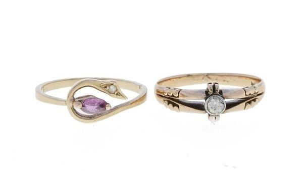 3036. Lot de deux bagues, l'une sertie d'une pierre d'imitation pour le diamant et l'une d'un rubis taille marquise
