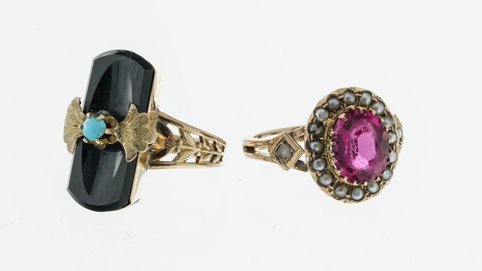 3073. Lot de deux bagues, l'une sertie d'une plaque d'onyx surmontée d'une turquoise en cabochon, l'autre sertie d'un verre rose entouré de demi-perles