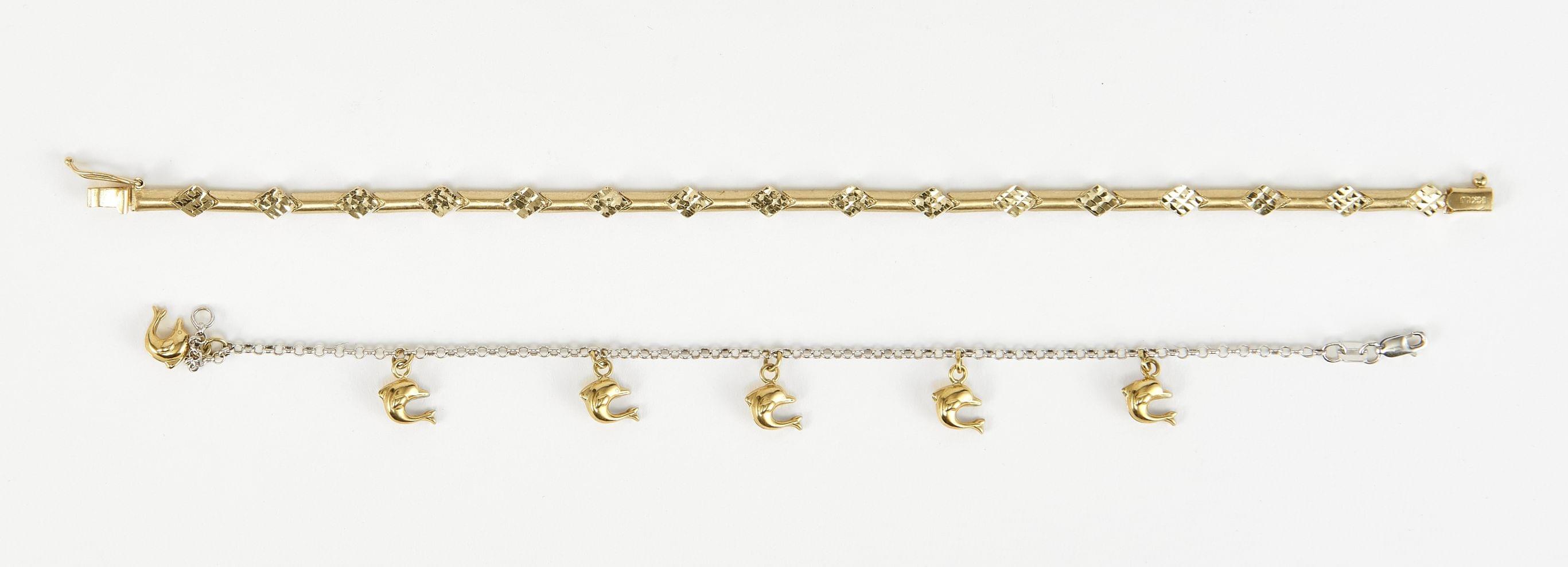 3302. Lot de deux bracelets, l'un retenant des pendeloques dauphins deux ors