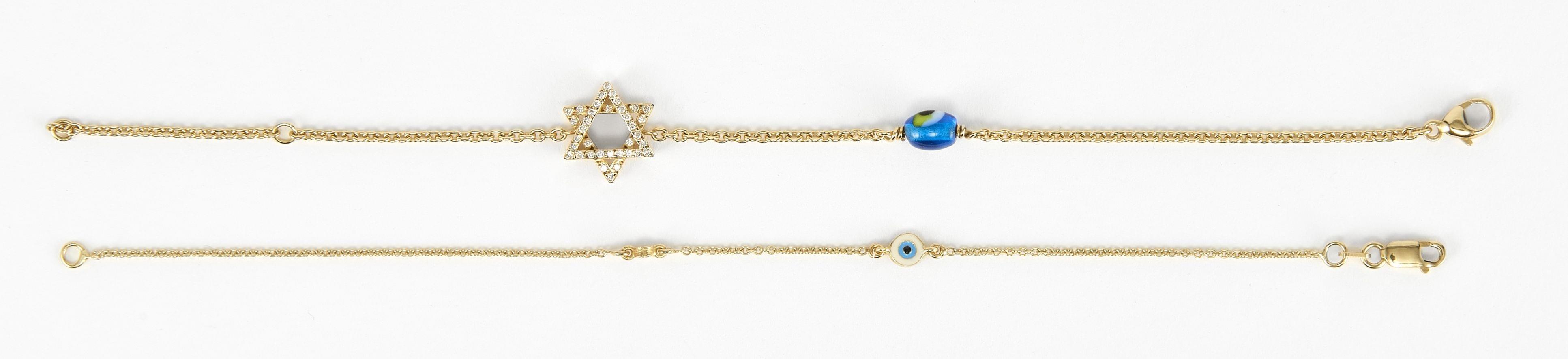 3143. Lot de deux bracelets, l'un retenant une étoile de David sertie de diamants et une perle de verre "œil" et l'autre serti d'un petit diamant et d'un motif "œil"