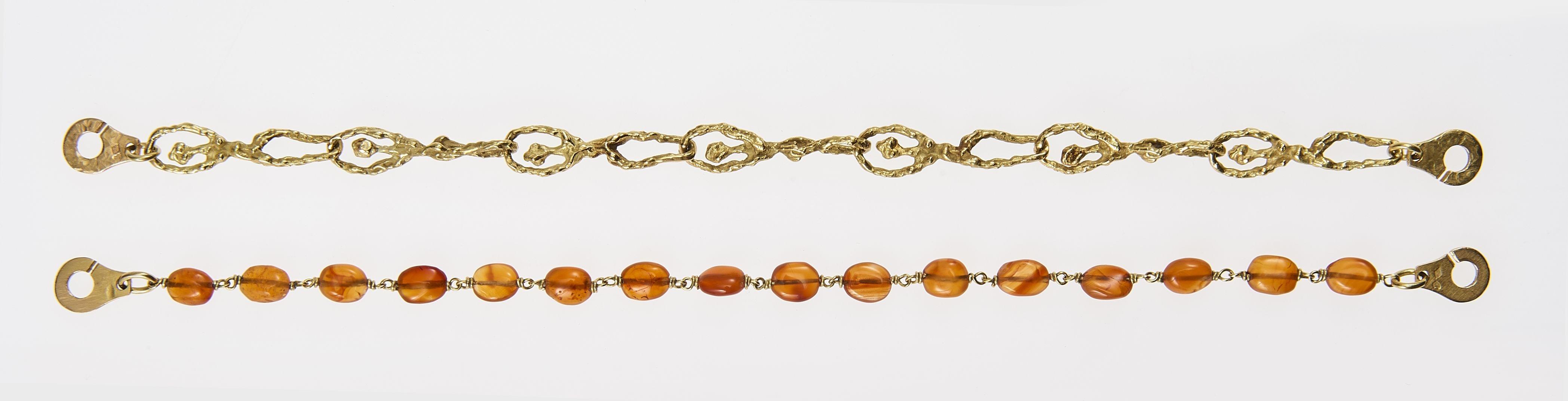 L'un composé de perles d'ambre et l'autre à maille stylisée de personnages, travail français, or 750, L 19,5, poids brut 18 g. Provenance: collection Pernet-Villaverde