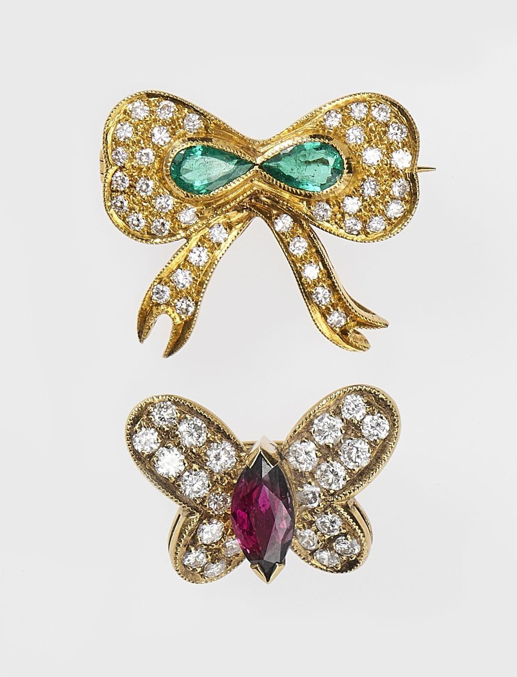L'une à motif de nœud centré d'émeraudes taille poire entourées de diamants et l'autre à motif de papillon centré d'un rubis taille marquise rehaussé d'un pavage de diamants, or 750, L 1,5 et 2 cm, poids brut 5 g. Provenance: collection Pernet-Villaverde
