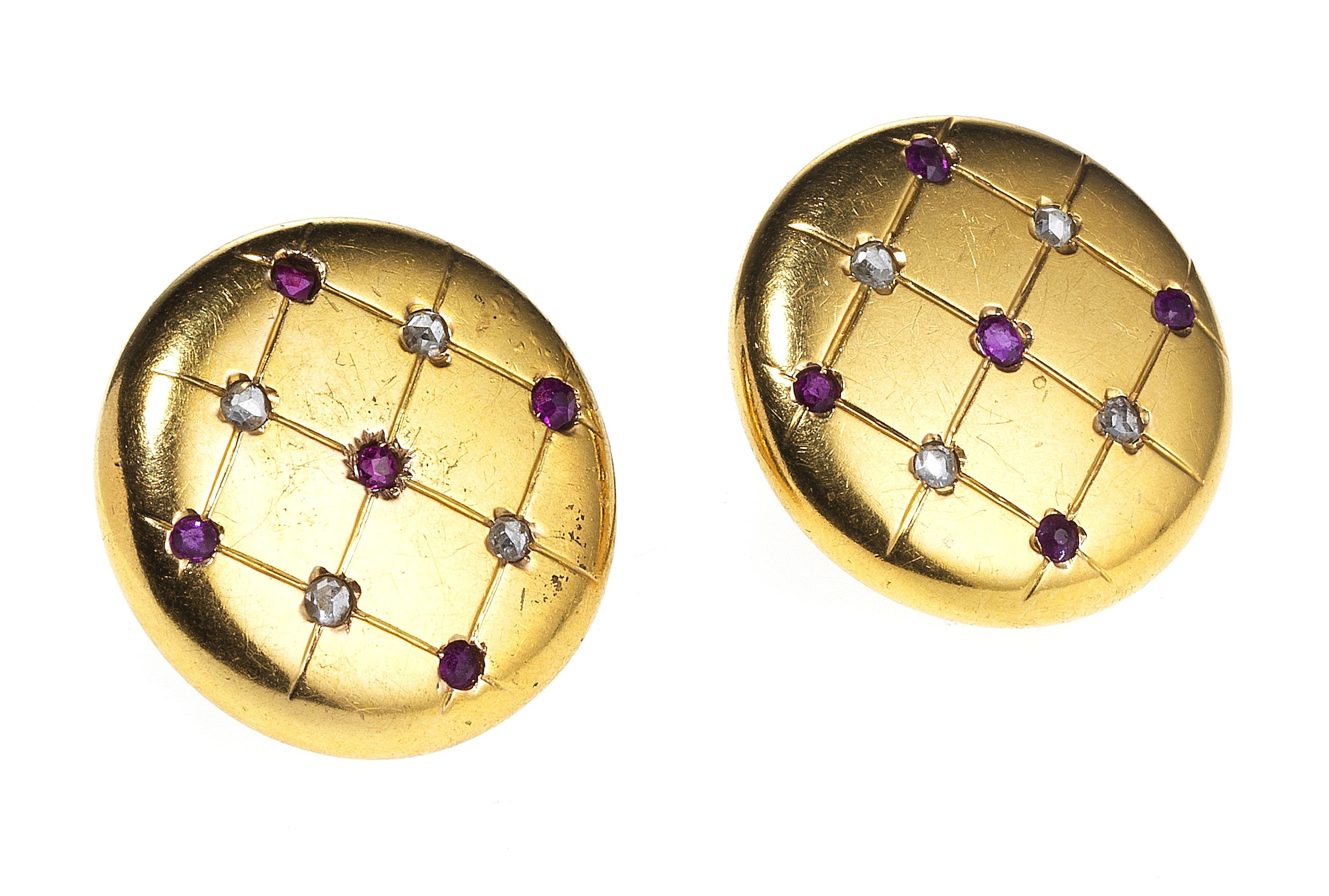3293. Lot de deux broches-clips ronds sertis de diamants et de rubis
