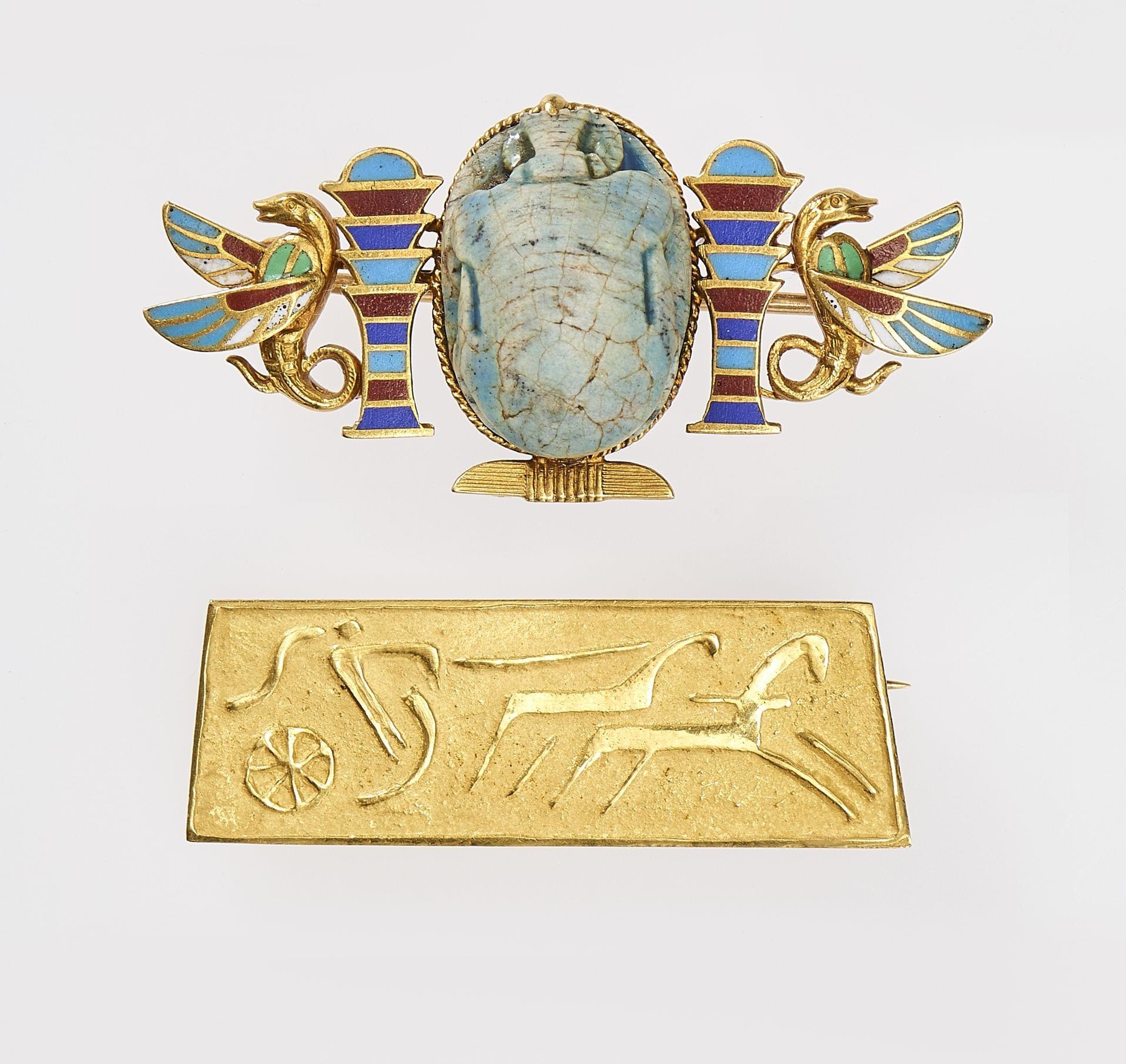 3318. Lot de deux broches de style antique, l'une émaillée sertie d'un scarabée égyptien et l'autre à motif d'aurige
