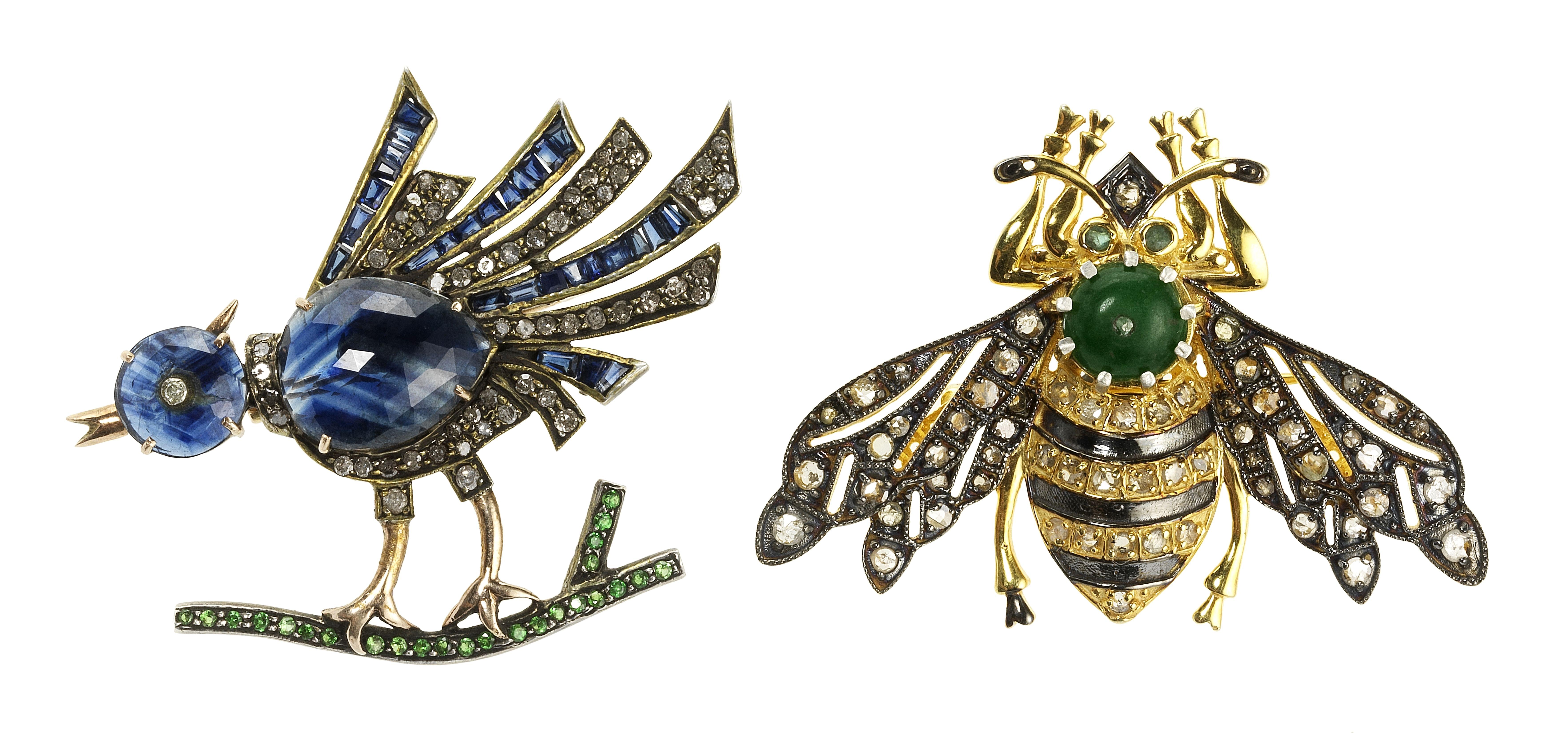 La première à la tête et au corps sertis d'un saphir facetté et pavée de roses de diamant, saphirs et tsavorites, la seconde émaillée, centrée d'une émeraude et pavée de roses de diamants, argent et vermeil 925, L 5 cm, l'oiseau accompagné d'un certificat AIG. Pour les lots précédés d'un *, la TVA de 7,7% est due sur l'entier du prix d'adjudication.