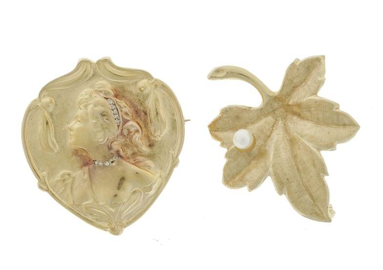3104. Lot de deux broches, l'une à décor de portrait de jeune fille sertie de roses de diamants et l'autre à motif de feuille sertie d'une perle