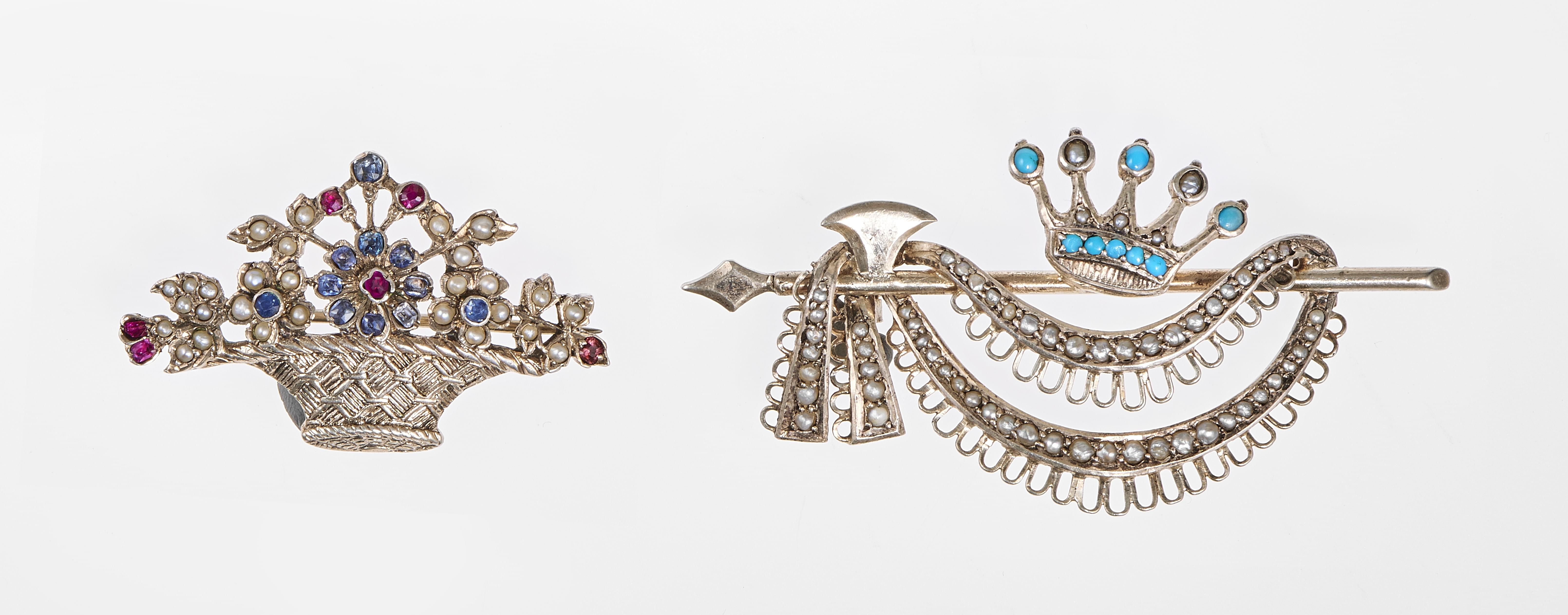 3157. Lot de deux broches, l'une à motif de couronne sertie de turquoises et l'autre à motif de panier fleuri serti de saphirs, rubis et demi-perles
