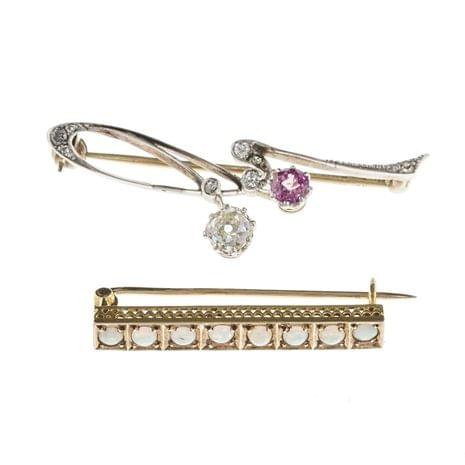 3176. Lot de deux broches, l'une sertie d'un diamant taille ancienne (env. 0.45 ct) et d'un rubis, l'autre formant une ligne d'opales
