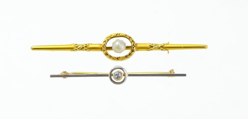 3143. Lot de deux broches, l'une sertie d'une perle et l'autre d'un diamant d'imitation