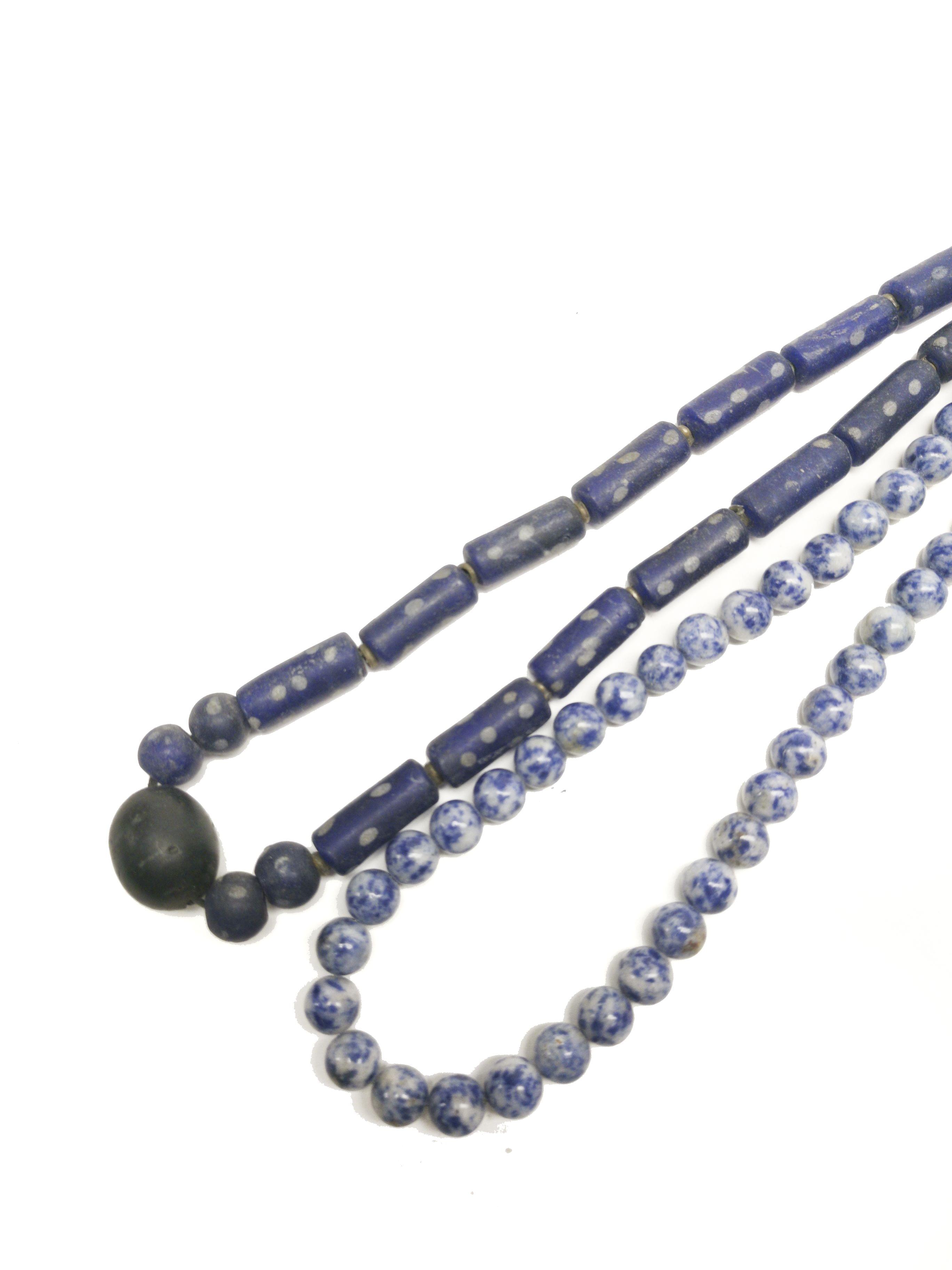 L'un composé de perles de pâte de verre bleu à pois blancs et l'autre composé de perles de sodalite, fermoir en métal, L 50 et 60 cm