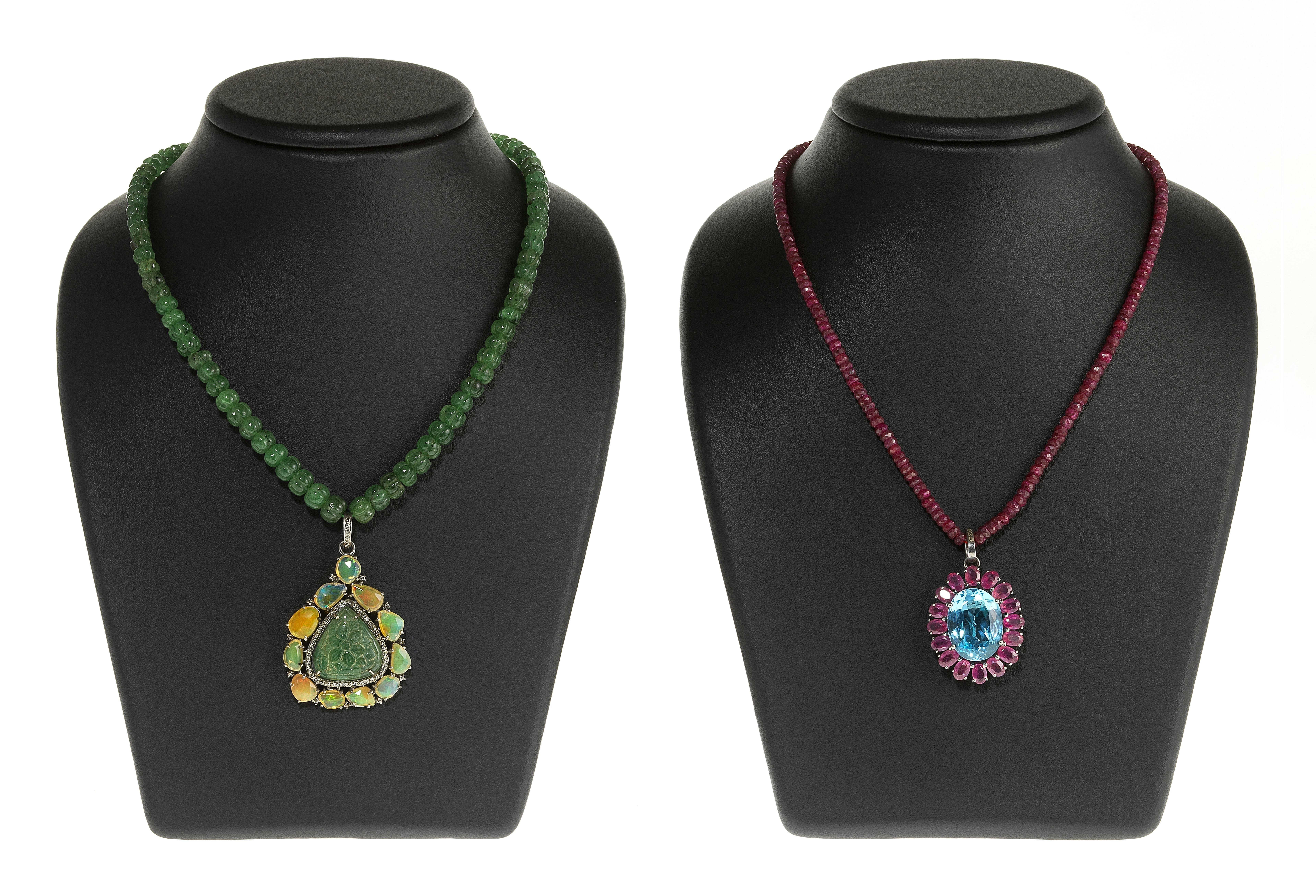 L'un composé de perles facettées de rubis retenant un pendentif centré d'une topaze bleue entourée de rubis, l'autre composé de perles sculptées d'émeraudes retenant un pendentif centré d'une émeraude sculptée entourée de roses de diamants et d'opales (sans fermoir), argent 925, L 46 et 43 cm. Pour les lots précédés d'un *, la TVA de 7,7% est due sur l'entier du prix d'adjudication.