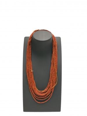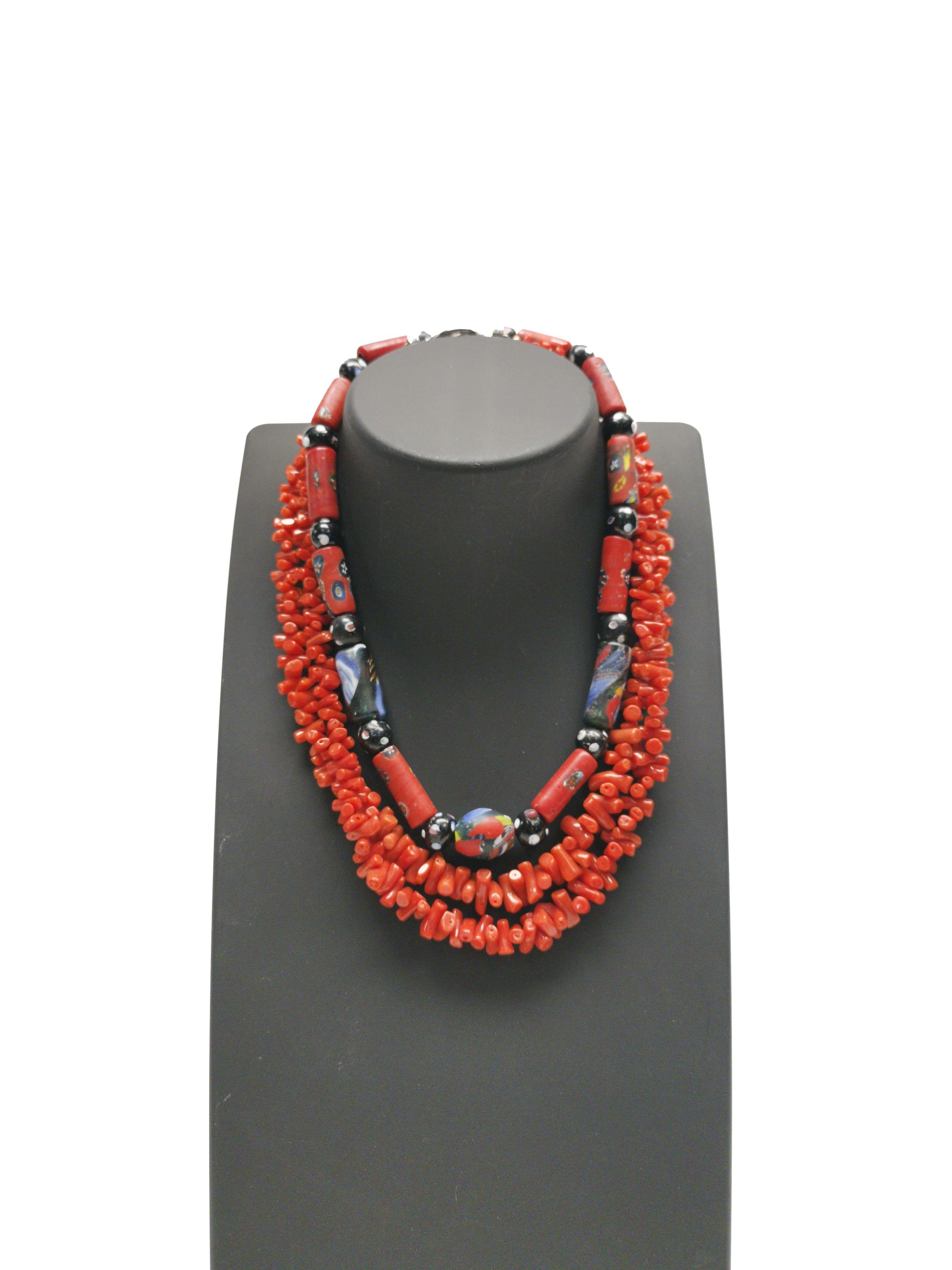 L'un composé de perles de pâte de verre rouge et noires et l'autre compose de deux rangs de corail en bâtonnets, fermoirs en argent et métal, L 46 et 52 cm