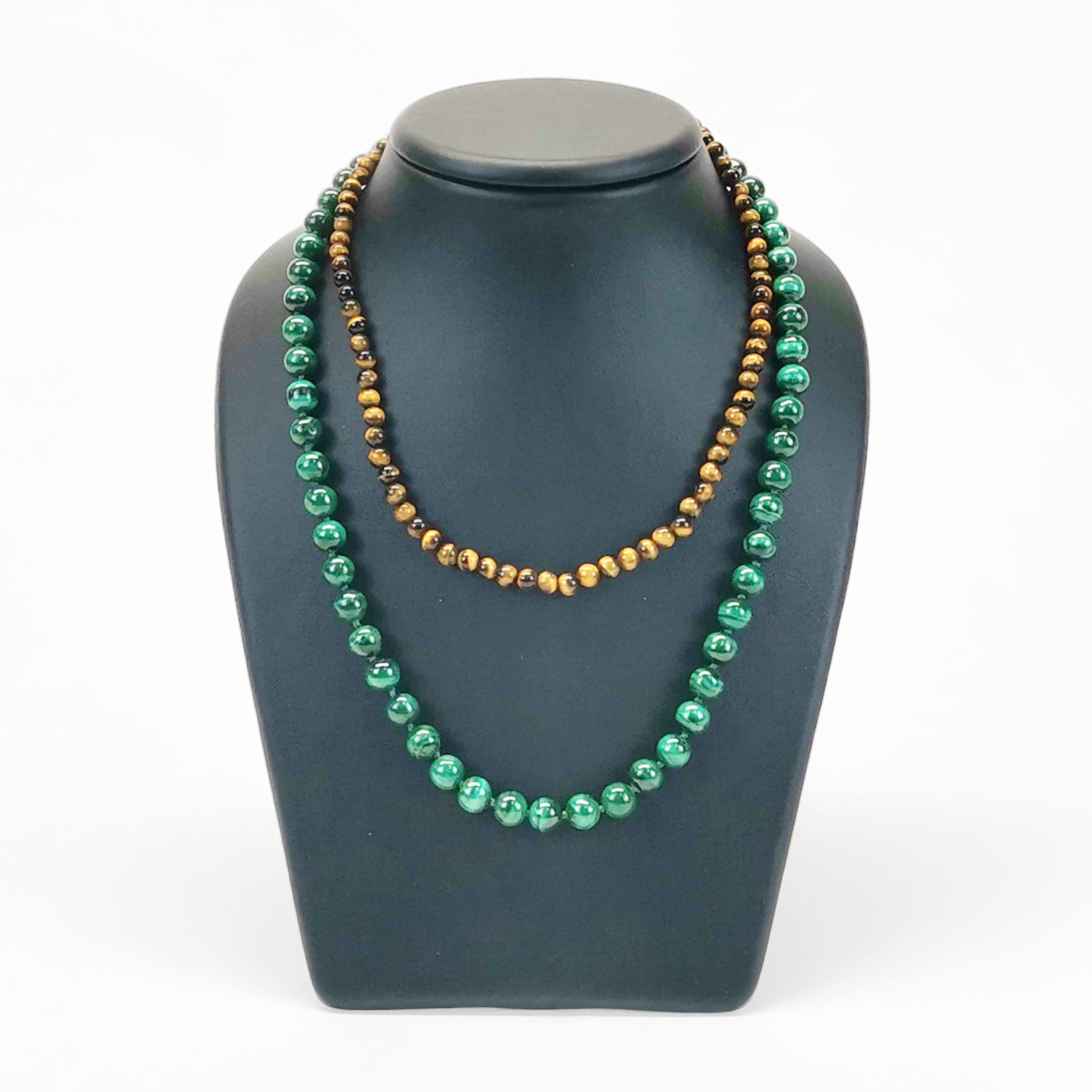 L'un composé de perles de malachite (D env. 8 mm), le second composé de perles d'œil de tigre en légère chute (D entre 4,8 et 5,1 mm), fermoirs en métal, L 52 et 41 cm