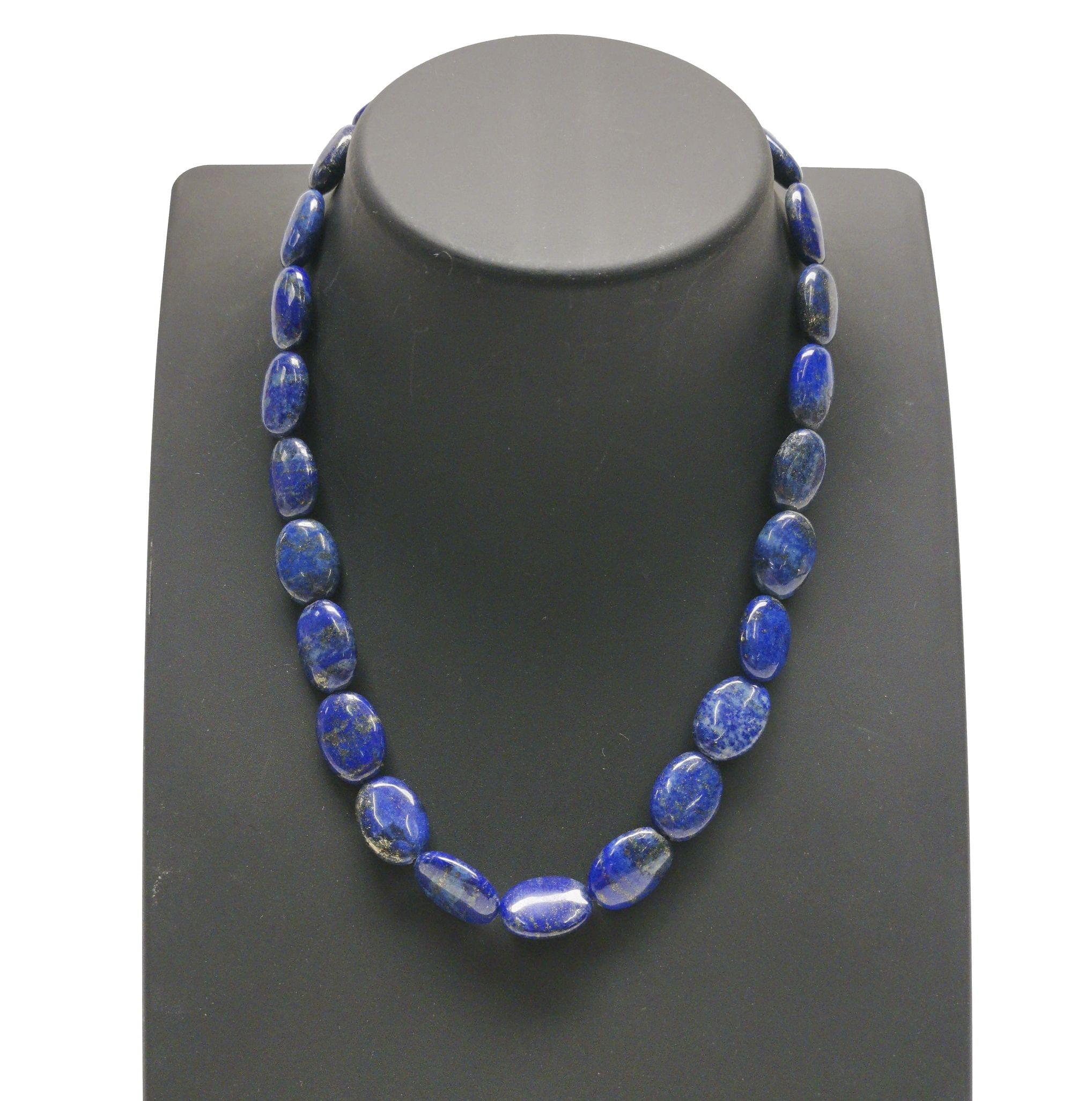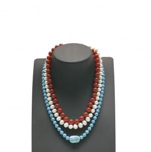 L'un composé de trois rangs de perles, de perles de corail et de perles de turquoise retenant un scarabée et l'autre composé de perles de lapis-lazuli ovales plates, fermoirs en métal et métal doré, l'un serti de pierres d'imitation, L 45 cm