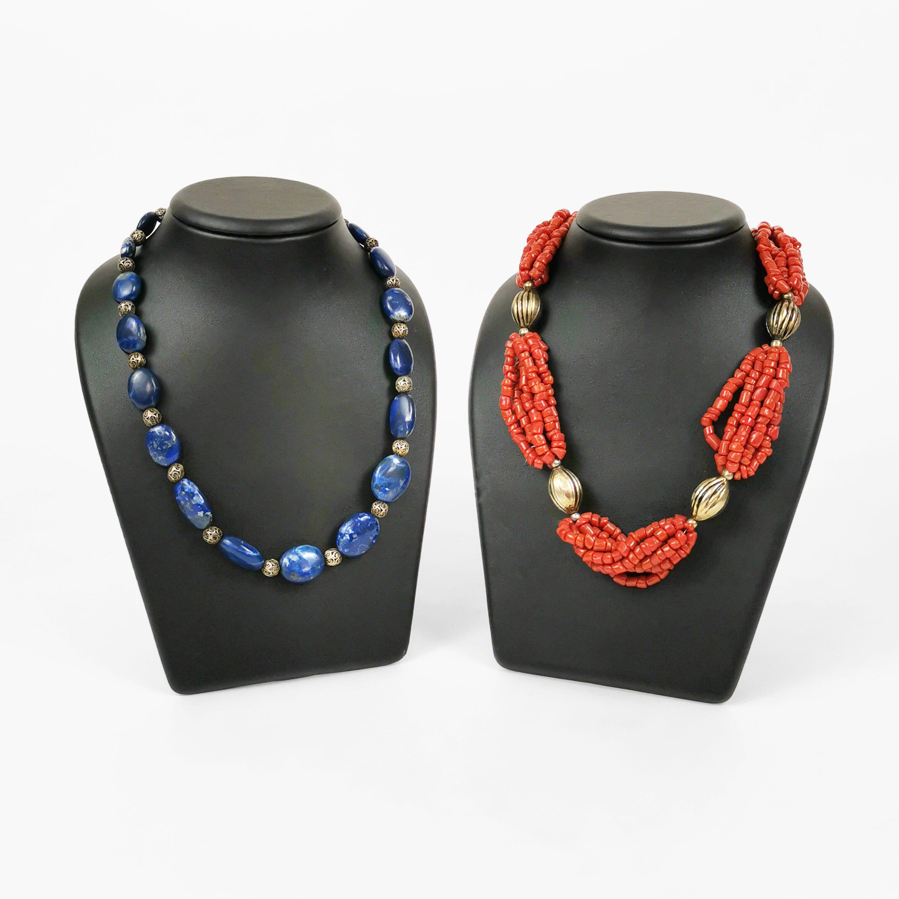L'un composé de perles ovales de lapis-lazuli alternées de motifs filigrannés et l'autre composé de perles de corail alternées d'oves godronnées, métal, L env. 65 et 80 cm