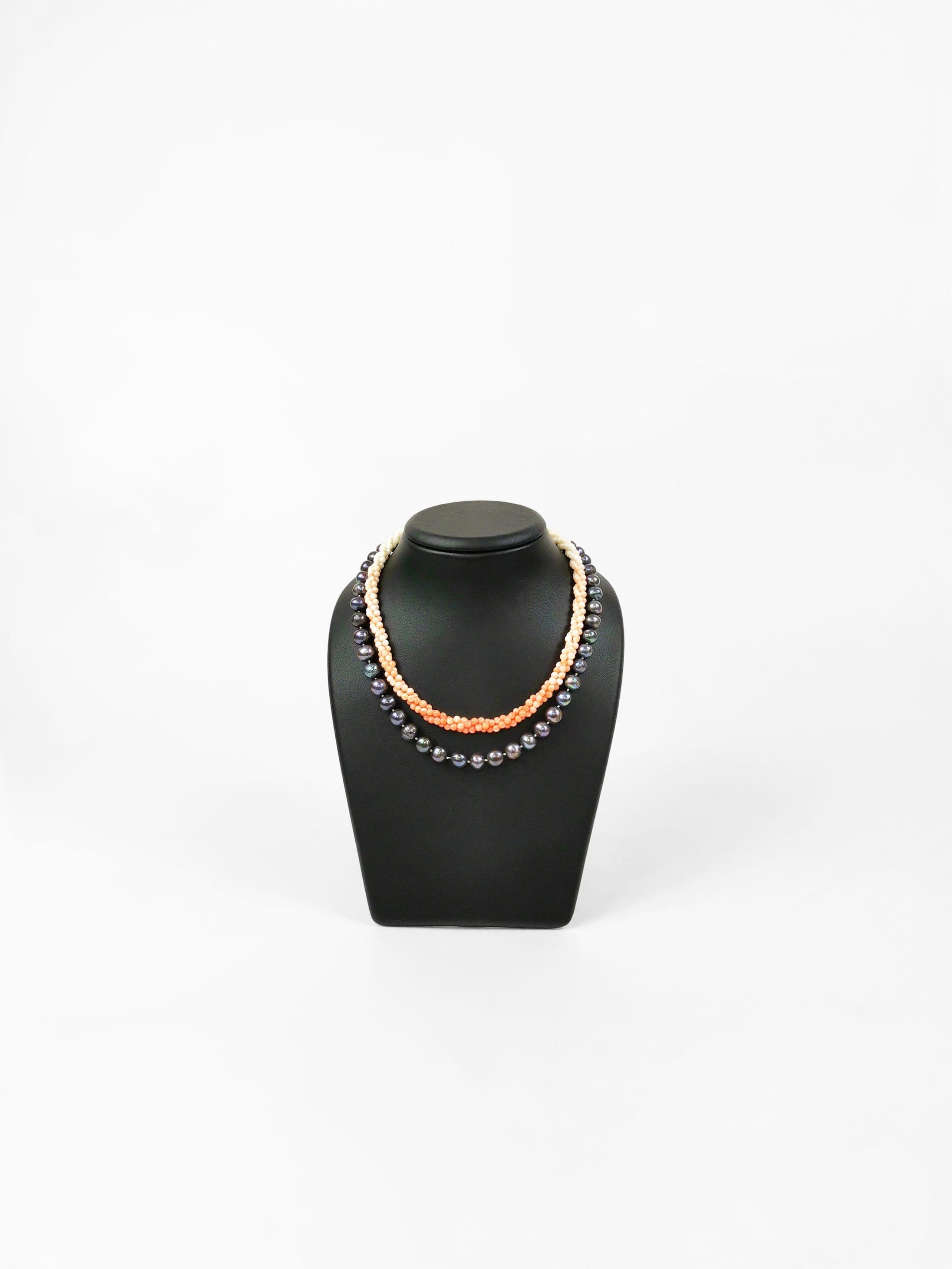 L'un composé de perles de corail en dégradé de couleurs allant du blanc au rose (D env. 3,5 mm), l'autre composé de perles d'eau douce violettes (D env. 8,5 mm), fermoirs en métal et métal doré, L 45 et 47 cm