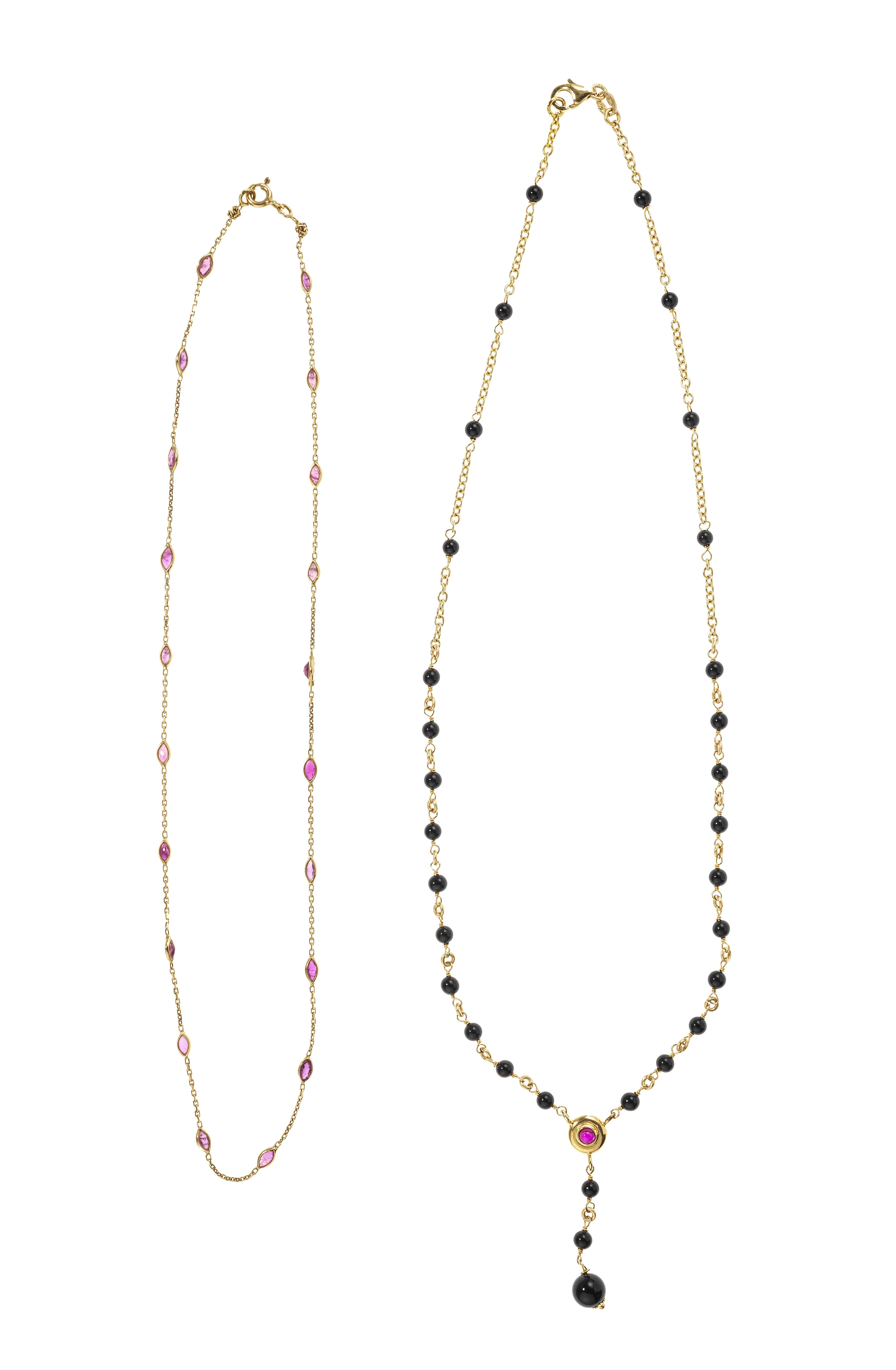 L'un serti de rubis taille navette et le second ponctué de perles d'onyx et centré d'un rubis cabochon, or 750, L 38 et 41 cm, poids brut 10 g. Pour les lots précédés d'un *, la TVA de 7,7% est due sur l'entier du prix d'adjudication.